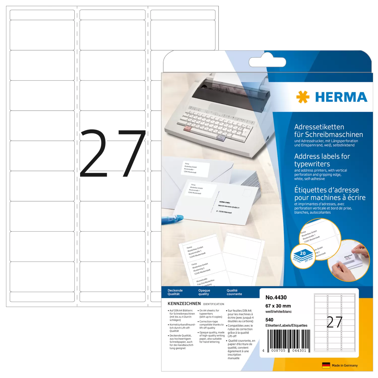 Adressetiketten für Schreibmaschinen, A4, 67 x 30 mm, weiß, permanent haftend