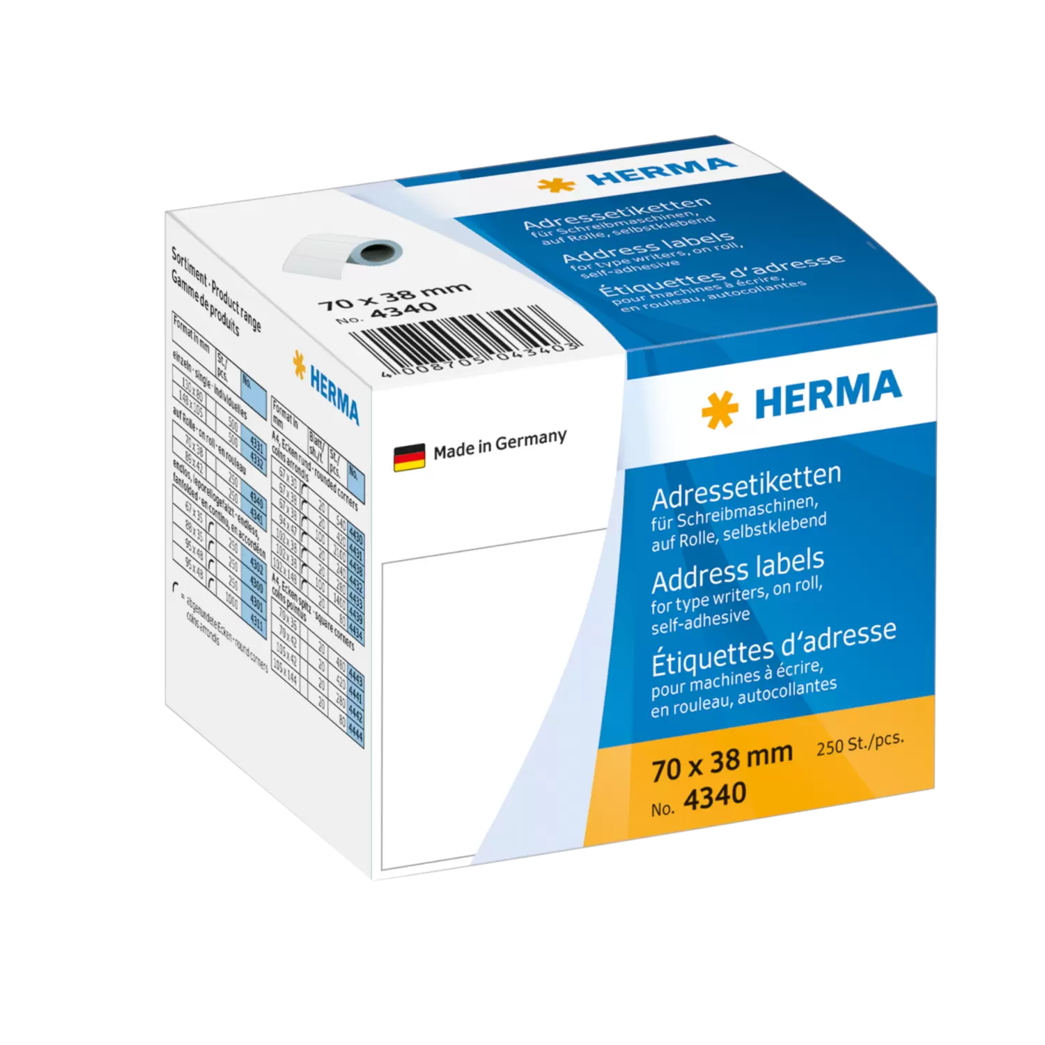 Adressetiketten für Schreibmaschinen, auf Rollen, selbstklebend. Ideal für Schreibmaschinen mit feststehendem Wagen. Zum Adressieren, zum Kennzeichnen von Akten, Behältern, Mustern, Fotos oder zum Überkleben. Aus hochwertigem, holzfreiem weißem Schreibpapier, FSC® Mix Credit-zertifiziert, chlorfrei gebleicht, lösemittelfreier Haftkleber. Deckende Qualität. Korrekturbandfreundlich durch Lift-Off-Qualität. Für Schreibmaschinen und Handbeschriftung.
