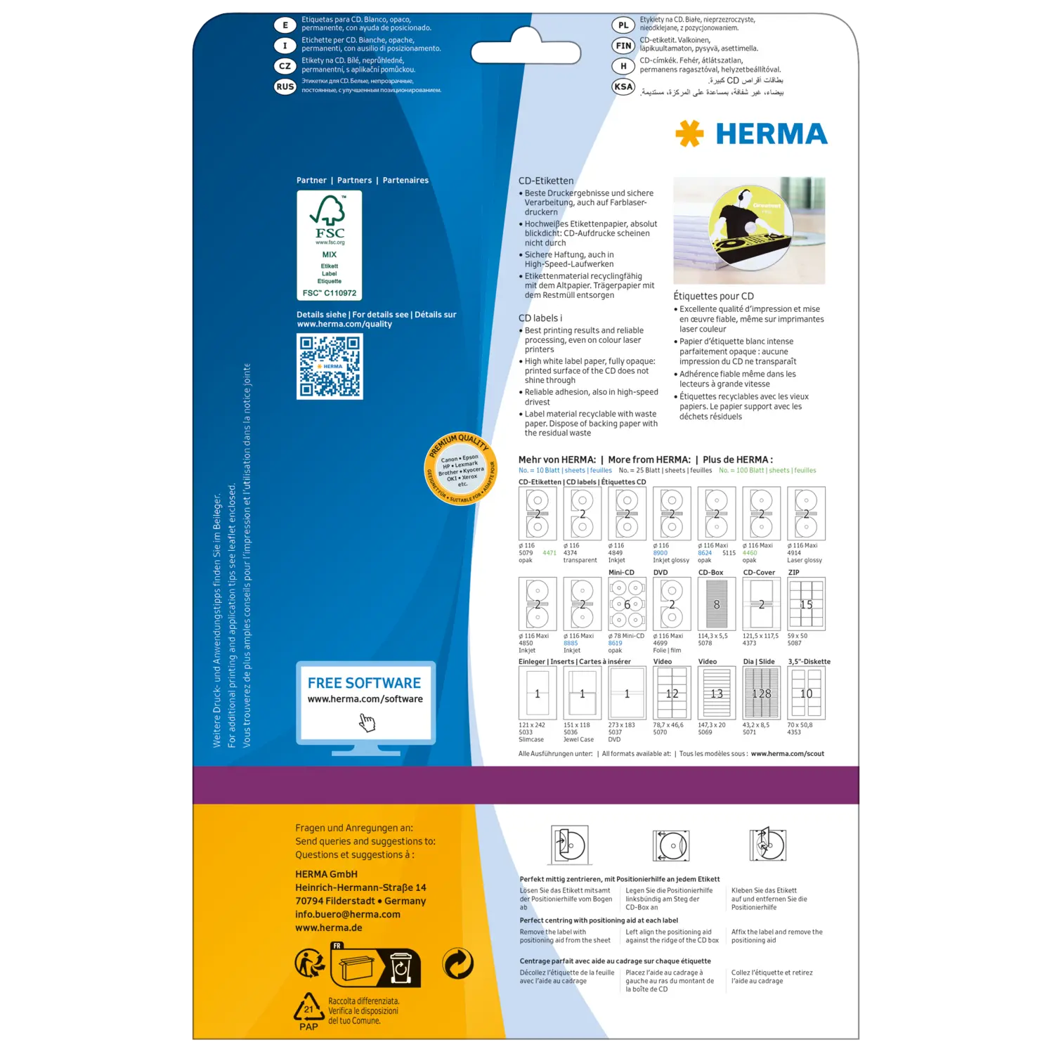 CD-Etiketten aus Papier, auf A4-Blättern, selbstklebend. Absolut blickdichtes Material mit hohem Weißgrad, CD-Aufdrucke scheinen nicht durch. Einfaches mittiges Aufkleben durch Positionierhilfe an jedem Etikett. Sichere Haftung, auch in High-Speed-Laufwerken. Umweltfreundlich: hochwertiges, chlorfrei gebleichtes Spezialpapier, FSC® Mix Credit-zertifiziert, lösemittelfreier Haftkleber, Verpackung aus Recyclingkarton. Sehr gute Druckergebnisse auf allen Laser- und Inkjetdruckern, Kopierern, Farblaserdruckern und Farbkopierern. Störungsfreie Verarbeitung durch Rundum-Sicherheitskante und optimale Planlage. Kostenlose Softwarelösungen: www.herma.de/software.