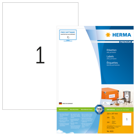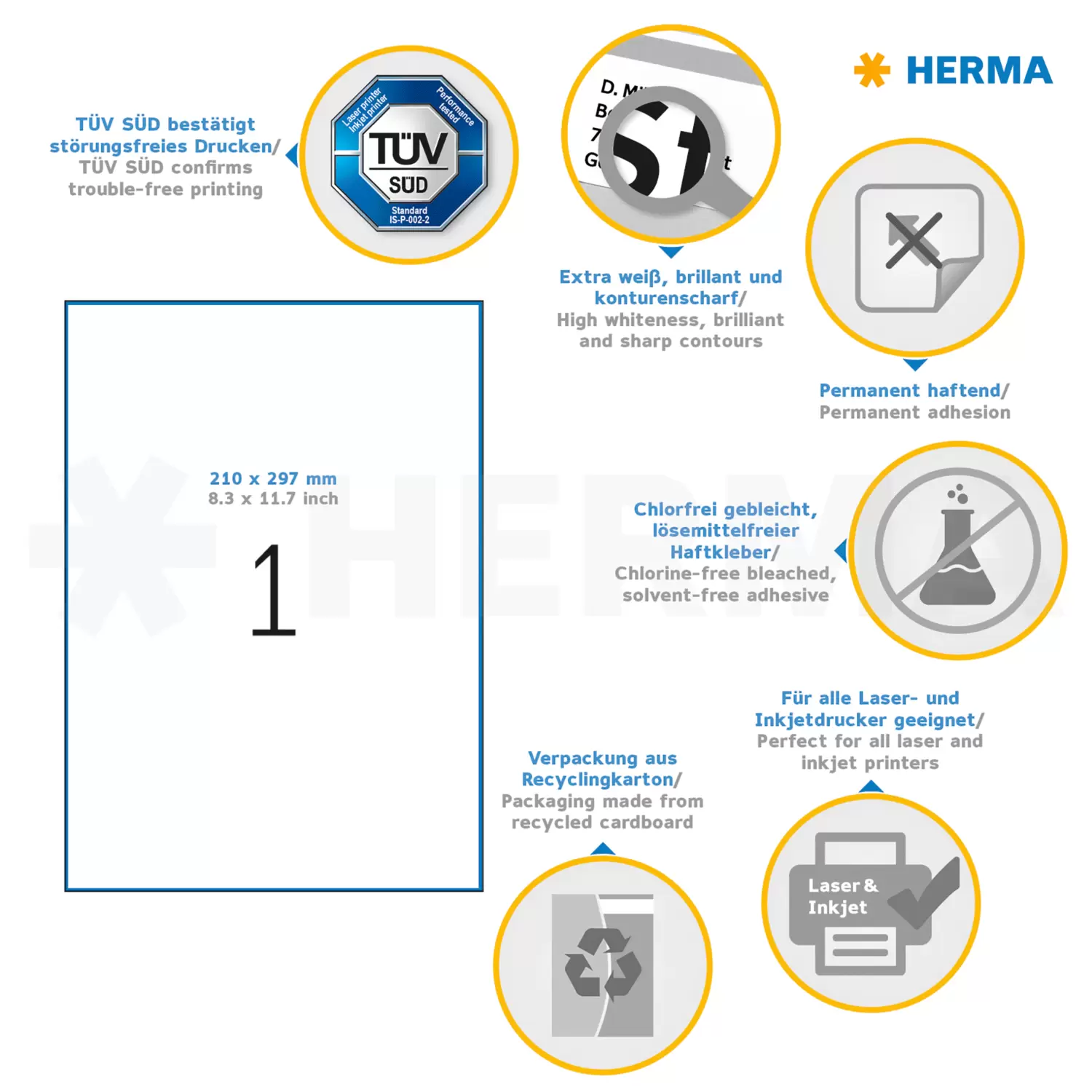 Selbstklebende Etiketten auf A4-Blättern, permanent haftend. Perfekt für alle Laser- und Inkjetdrucker, Kopierer, Farblaserdrucker und Farbkopierer. Garantiert staufrei und high-speed-fähig durch extra starken Spezialverbund, Top-Planlage und Rundum-Sicherheitskante. Problemloser Druckerdurchlauf für Laserdrucker und Inkjetdrucker getestet und bestätigt durch den TÜV SÜD. Hoher Weißegrad und gleichmäßige Oberfläche für beste Druckergebnisse in Schwarz und Farbe. Spürbar dicker: extra starke Etiketten, einfaches Aufkleben. Besonders schnell und sicher haftend, auch auf kühlen und feuchten Oberflächen. Umweltschonend und nachhaltig: chlorfrei gebleicht, FSC® Mix Credit-zertifiziert, lösemittelfreier Haftkleber. Etikettenmaterial recyclingfähig mit dem Altpapier, Trägerpapier mit dem Restmüll entsorgen, Verpackung aus Recyclingkarton. Kostenlose Softwarelösungen: www.herma.de/software.