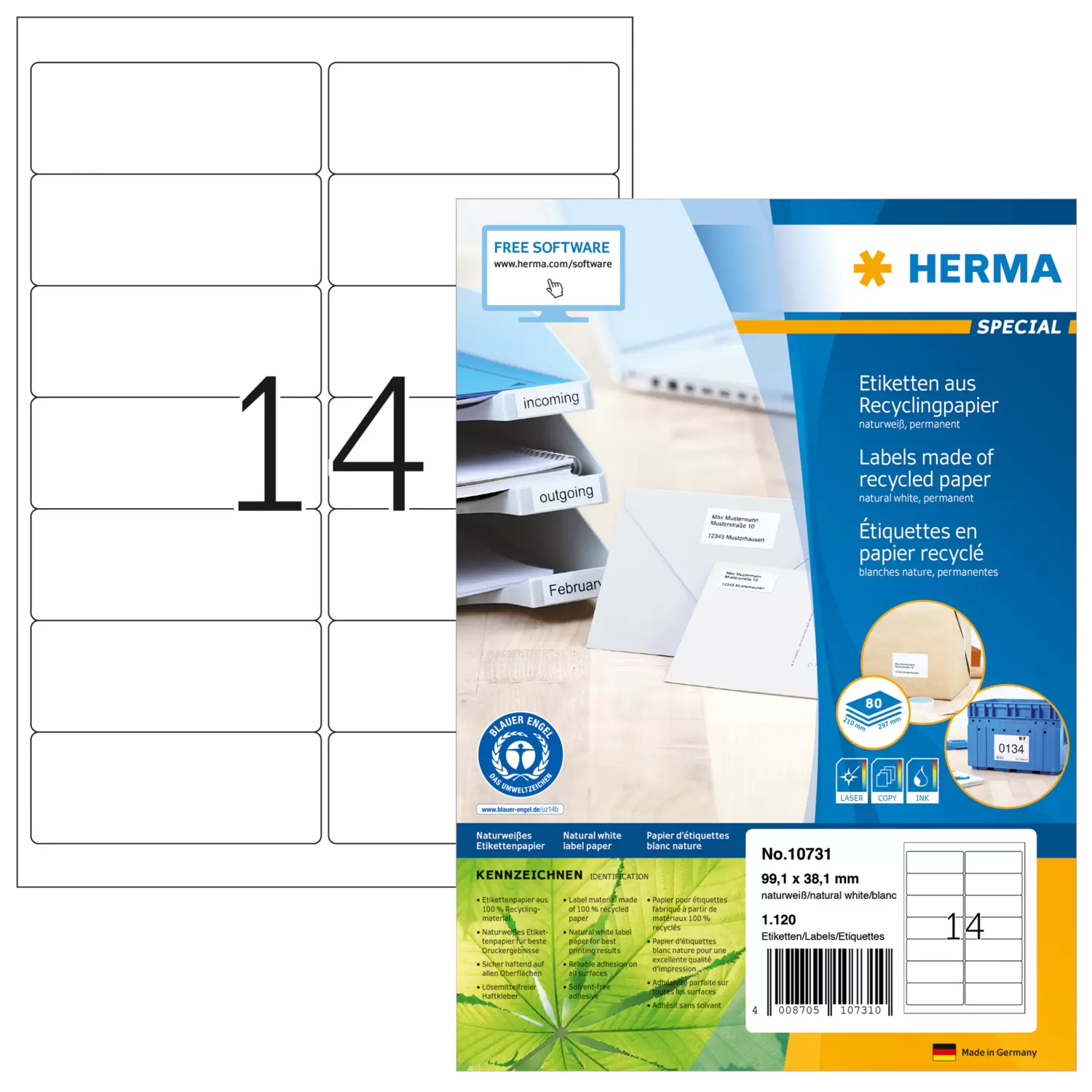 Selbstklebende Etiketten aus naturweißem Recyclingpapier, auf A4-Blättern. Ausgezeichnet mit dem Blauen Engel. Ideal zum Adressieren und Kennzeichnen. Etikettenpapier aus 100 % Recyclingpapier. Hoher Weißegrad (ISO 97/CIE 133), ohne Chlorbleiche. Wasserbasierender lösemittelfreier Haftkleber. Etikettenpapier ist zu 100 % recyclingfähig mit dem Altpapier. Verpackung aus Recyclingkarton. Störungsfreie Verarbeitung durch Rundum-Sicherheitskante und optimale Planlage. Sehr gute Druckergebnisse auf allen Laser- und Inkjetdruckern, Kopierern, Farblaserdruckern und Farbkopierern. Kostenlose Softwarelösungen: www.herma.de/buero-zuhause/vorlagen-software/.