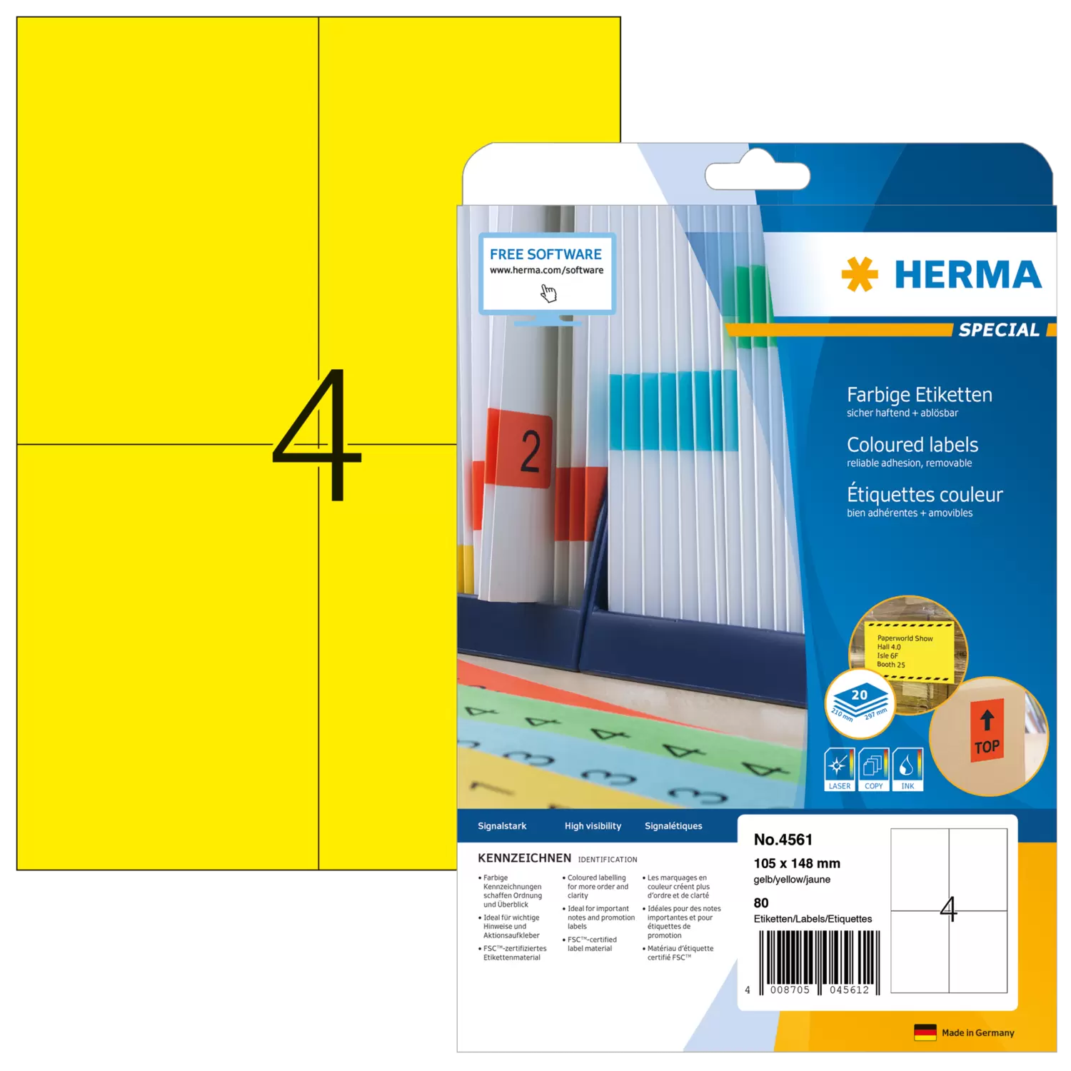 Farbige Etiketten auf A4-Blättern, selbstklebend. Ideal für Kennzeichnungen mit Signalcharakter, z. B. Warnhinweise, Eilvermerke, Adressänderungen, Farbcodierung, Aktionen,... Umweltfreundlich: FSC® Mix Credit-zertifiziertes Etikettenpapier, chlorfrei gebleicht, lösemittelfreier Haftkleber. Etiketten sind 100 % recyclingfähig mit dem Altpapier, Verpackung aus Recyclingkarton. Sehr gute Druckergebnisse auf allen Laser- und Inkjetdruckern, Kopierern, Farblaserdruckern und Farbkopierern. Störungsfreie Verarbeitung durch Rundum-Sicherheitskante und optimale Planlage. Kostenlose Softwarelösungen: www.herma.de/software.