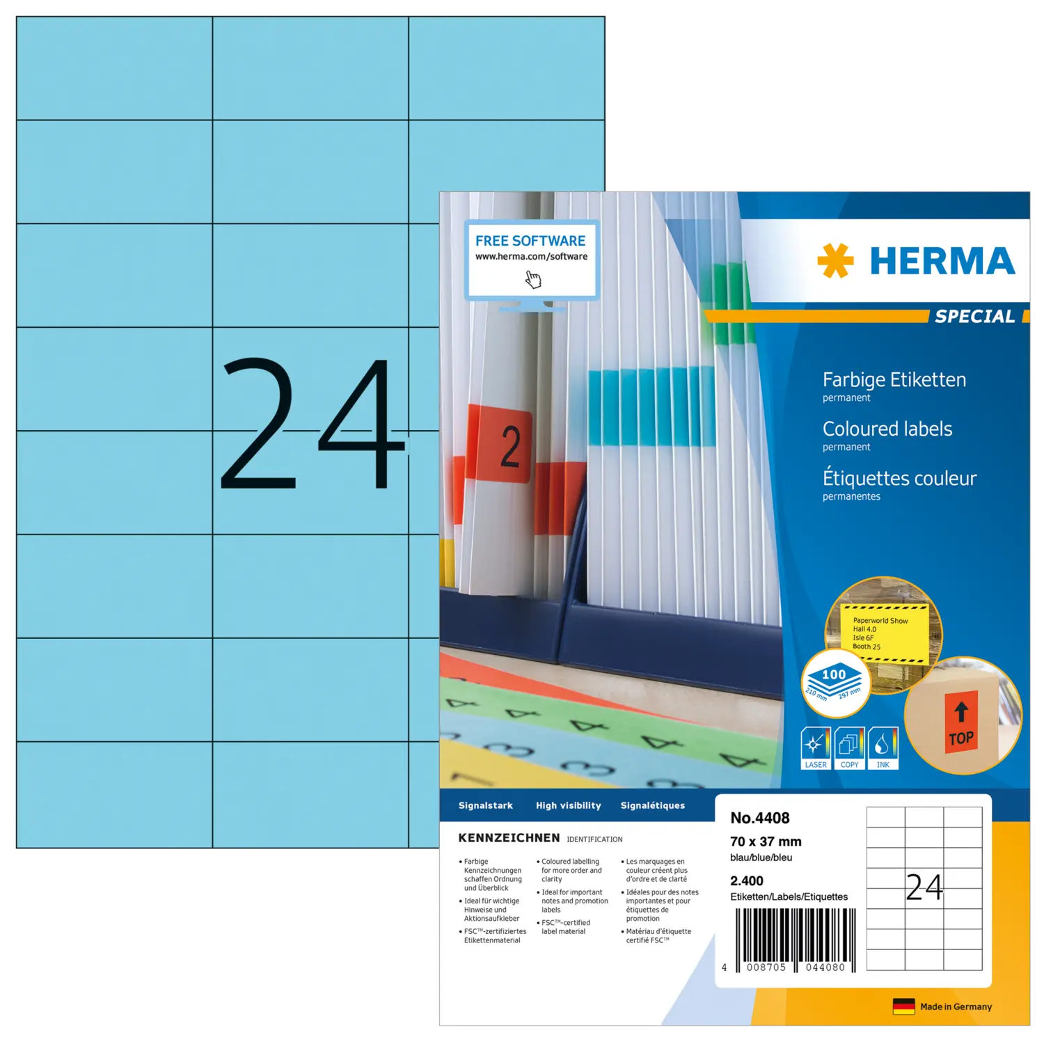 Farbige Etiketten auf A4-Blättern, selbstklebend. Ideal für Kennzeichnungen mit Signalcharakter, z. B. Warnhinweise, Eilvermerke, Adressänderungen, Farbcodierung, Aktionen,... Umweltfreundlich: FSC® Mix Credit-zertifiziertes Etikettenpapier, chlorfrei gebleicht, lösemittelfreier Haftkleber. Etiketten sind 100 % recyclingfähig mit dem Altpapier, Verpackung aus Recyclingkarton. Sehr gute Druckergebnisse auf allen Laser- und Inkjetdruckern, Kopierern, Farblaserdruckern und Farbkopierern. Störungsfreie Verarbeitung durch Rundum-Sicherheitskante und optimale Planlage. Kostenlose Softwarelösungen: www.herma.de/software.