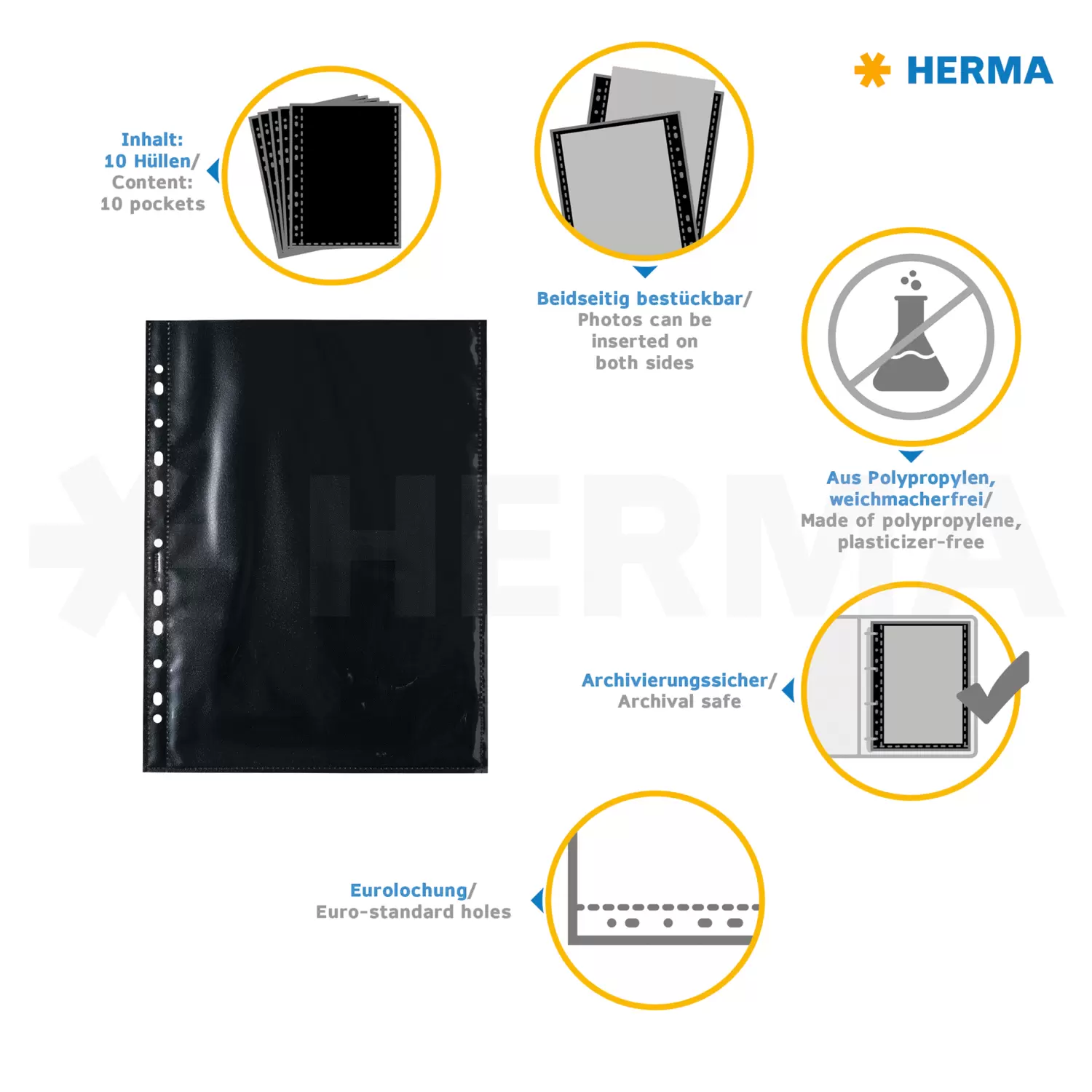 Die HERMA Fotosichthüllen Fotophan sind die praktischen Ordnungs- und Archivierungshelfer für Fotos, Bilder, Postkarten, Eintrittskarten und vieles mehr. Einfach in die Klarsichttaschen schieben und schon ist Alles sicher verstaut - unkompliziert und ganz ohne Kleben! Die Fotosichthüllen bestehen aus robustem schwarzem Polypropylen, mit beidseitig aufgeschweißten klar-transparenten Einstecktaschen für Fotos im Format bis zu 20 x 30 cm. So lassen sich 2 Fotos pro Hülle sicher und geschützt aufbewahren. Die Hüllen sind absolut weichmacherfrei und archivierungssicher, ohne chemische Einflüsse auf die Bilder. Pro Packung sind 10 Hüllen mit Platz für 20 Fotos enthalten. Durch die praktische Eurolochung lassen sie sich in alle gängigen Ordner, Alben und Ringbücher für DIN A4 Formate einheften. Ideal sind die HERMA Fotobooks, die in 5 tollen Farben erhältlich sind. Perfekter Schutz, ganz ohne Schmutz, Knicke oder Fingerabdrücke.