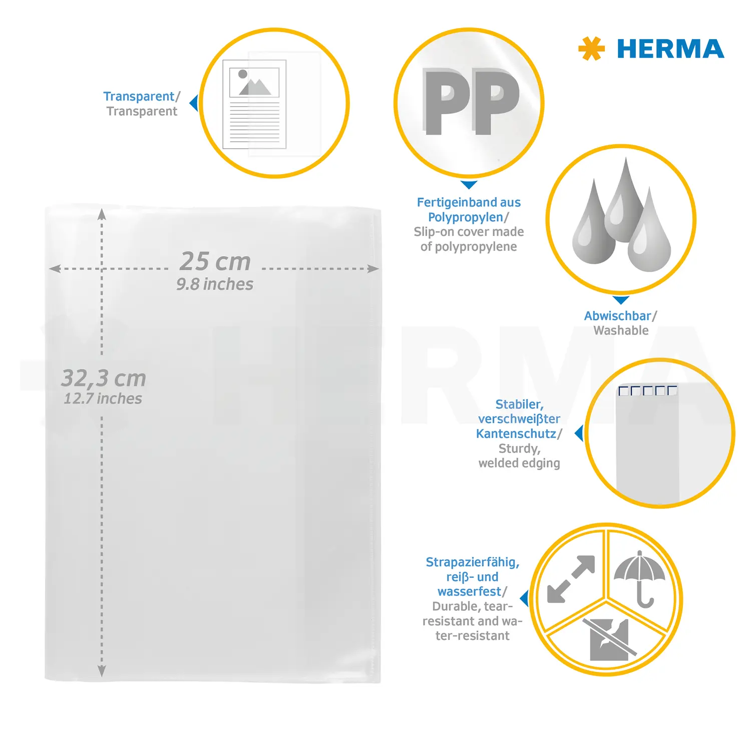 Schnellhefter und Spiralhefter aus Pappe werden im täglichen Einsatz in Büro und Schule oder beim Transport im Schulranzen oder Aktentasche schnell unansehnlich, verknicken, verschmutzen und müssen deswegen regelmäßig ersetzt werden. Der speziell dafür entwickelte, durchsichtige HERMA Schoner ist aus robuster, strapazierfähiger und abwischbarer Kunststoff-Folie produziert (Polypropylen PP) und schützt diese Karton Sammelmappen vor Schmutz, Dreck und Feuchtigkeit. So bleiben sie länger im Einsatz.