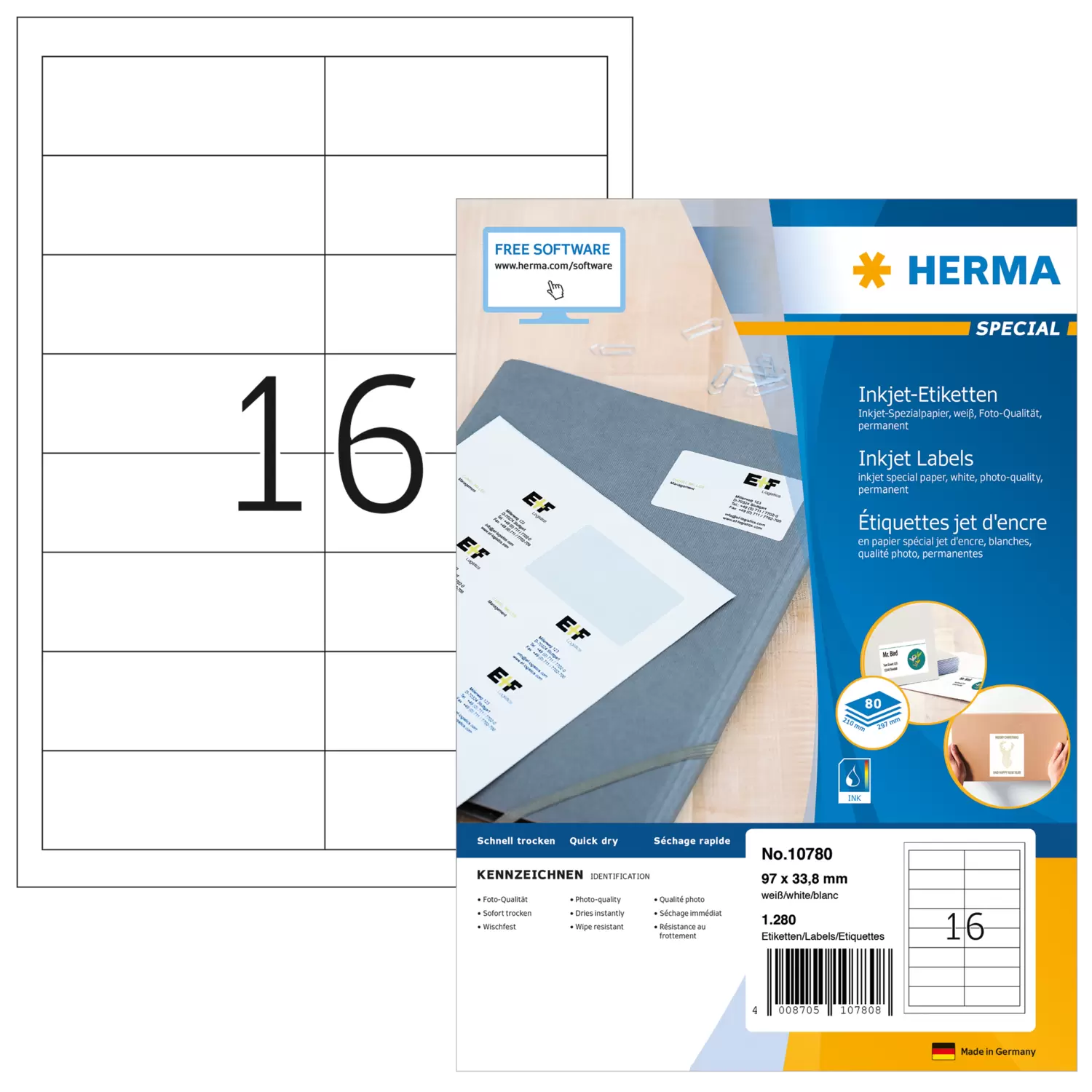 Etiketten, speziell für Inkjetdrucker, auf A4-Blättern, selbstklebend. Aus hochwertigem gestrichenem Spezialpapier, 90 g/m² für konturenscharfe und farbbrillante Drucke in Foto-Qualität. Störungsfreie Verarbeitung durch Rundum-Sicherheitskante und optimale Planlage. Alle Ausführungen mit umlaufendem Rand: vollflächig bedruckbar und ideal auch für Inkjetdrucker mit kritischen Papierführungen. Kostenlose Softwarelösungen: www.herma.de/software.