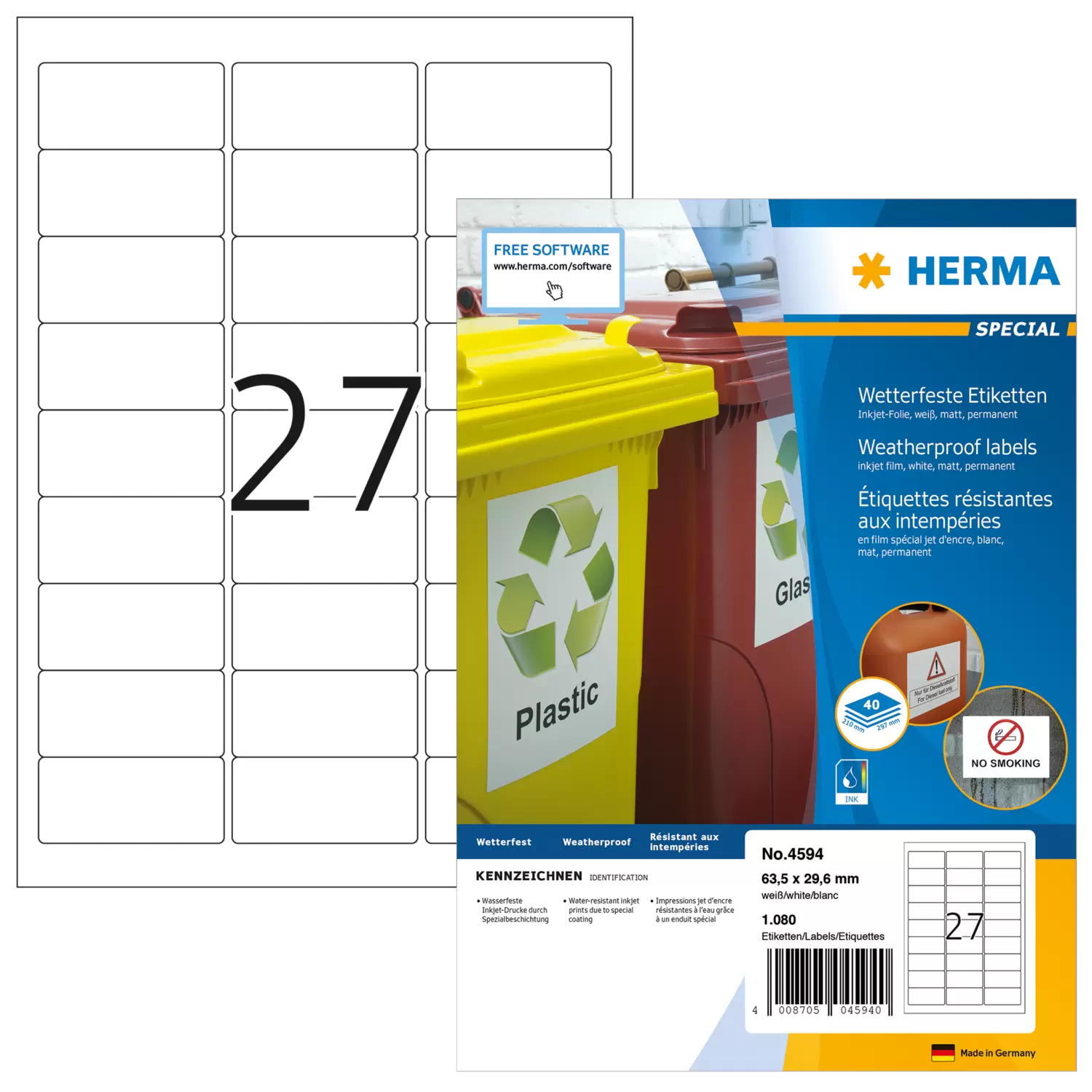 Wetterfeste Inkjet Folien-Etiketten auf A4-Blättern, weiß/matt, selbstklebend. Hervorragende Inkjetdrucke in Schwarz und Farbe. Für den Einsatz im gewerblichen und privaten Bereich, z. B. für die Auszeichnung von Waren im Freigelände, für Informationen am Schaufenster oder Hinweis- und Warnschilder. Garantiert wasserfeste Ausdrucke in Schwarz und Farbe, lichtechte Tinte verwenden. Spezialbeschichtung sorgt für Tintenfixierung direkt nach dem Druck. Mit umlaufendem Rand: vollflächig bedruckbar und ideal auch für Inkjetdrucker mit kritischen Papierführungen. Kostenlose Softwarelösungen: www.herma.de/software.