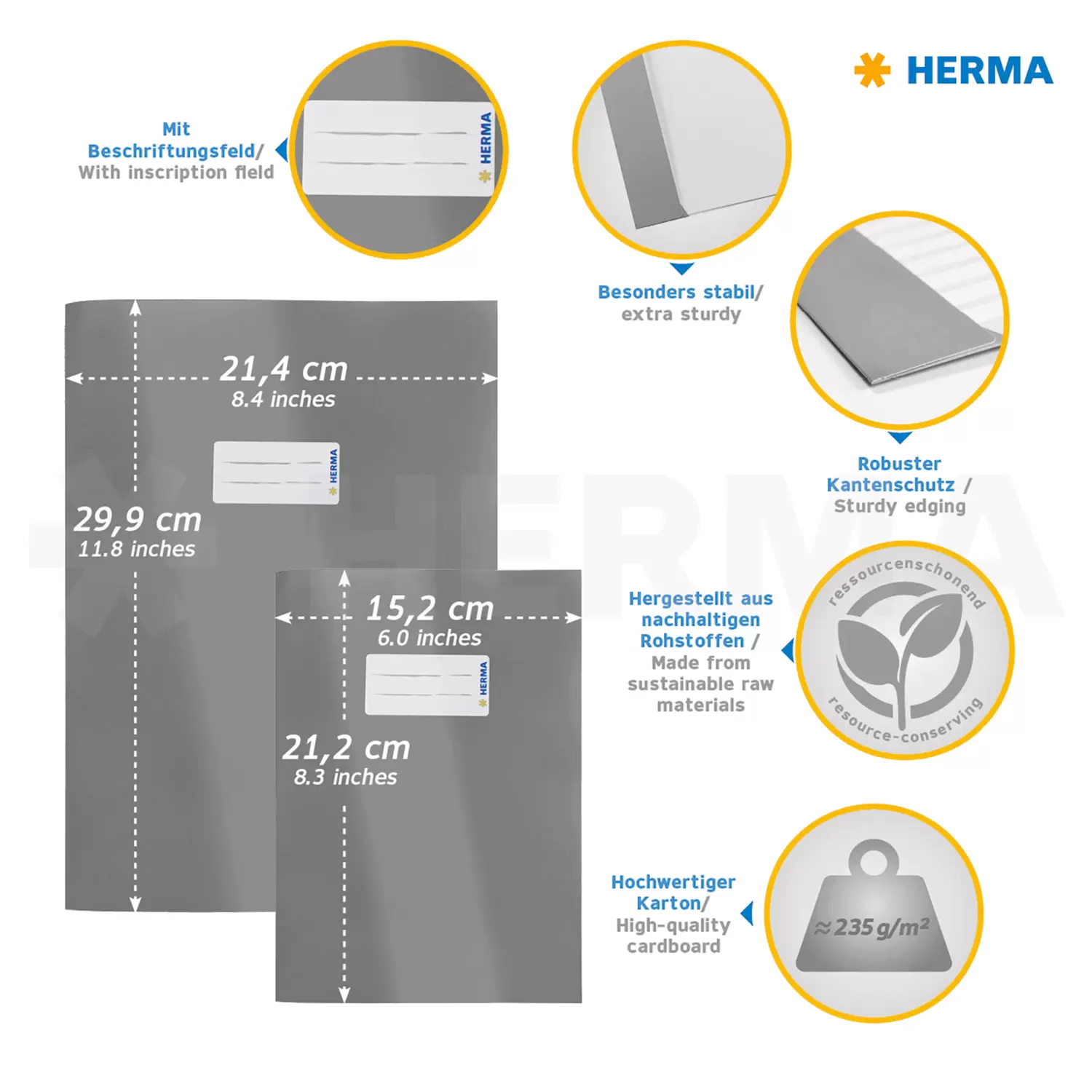 Dieser Heftschoner in gelb von HERMA eignet sich für sämtliche A5 Hefte. Der Heftumschlag bietet einen optimalen Schutz für Arbeitsunterlagen, Schulhefte oder Schreibhefte. Die Unterlagen aus Alltag, Schule, Universität oder Arbeit werden vor verschiedenen äußeren Einflüssen geschützt und es besteht nicht mehr die Gefahr, dass sie knicken. Ganz ohne Plastik und produziert aus stabilem Karton sind die Umschläge von HERMA robust und widerstandsfähig. Das kräftige Material aus extra starkem Papier ist in bewährter HERMA Qualität und umweltfreundlicher als herkömmliche Heftschoner aus Plastik. Der Umschlag für Hefte ist die optimale DIN A5 Hefthülle für alle Hefte, die nicht mehr von Schmutz und Feuchtigkeit angegriffen werden sollen, damit die enthaltenen Schriften sicher geschützt sind. Je nach dem, welche Farbe bevorzugt wird, kann zwischen 16 verschiedenen Farben gewählt werden. Auf dem aufgedruckten Beschriftungsfeld, welches gut sichtbar auf der Vorderseite angebracht ist, können Informationen über den Besitzer, das Fach oder die Thematik des Inhalts eingetragen werden. Dadurch sind Ordnung und saubere Hefte garantiert.