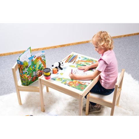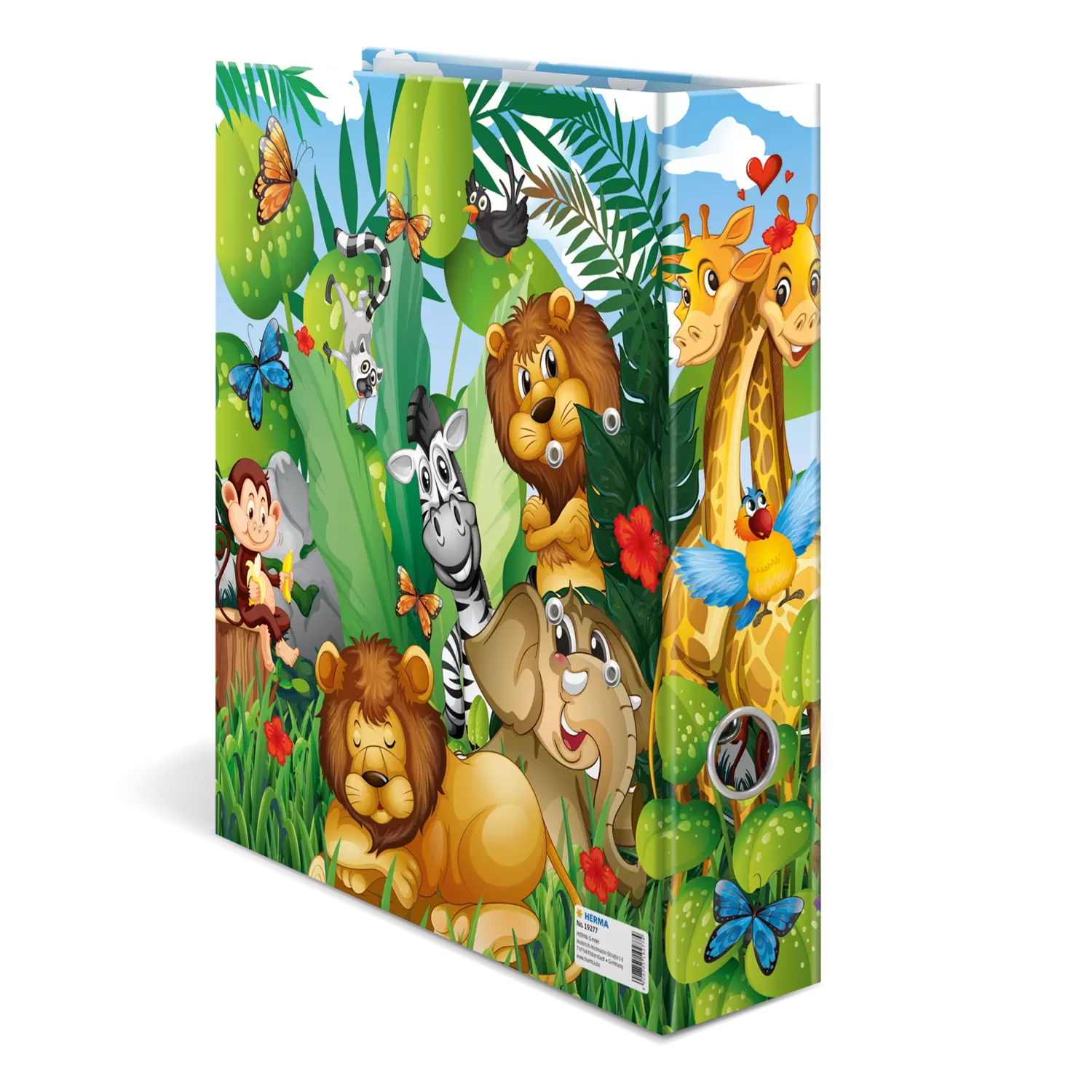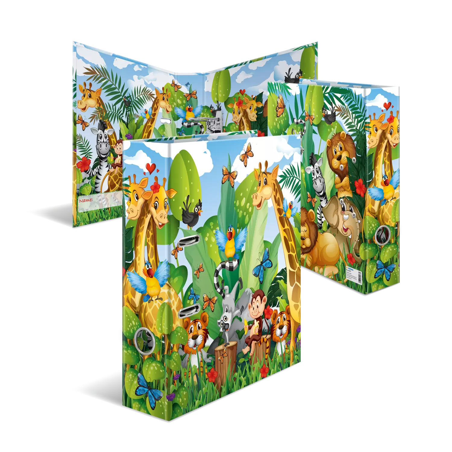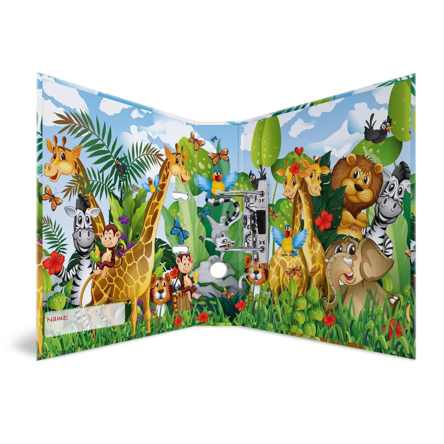 Welcome to the Jungle! Im farbenfrohen Design mit allerlei wilden Tieren kommt der Motiv-Ordner Dschungel daher. Verliebte Giraffen, hungrige Affen und viele Tiere, die was schaffen! Ein kunterbunter wilder Regenwald – da gibt es viel zu entdecken. Der Ordner ist speziell für die Kleinsten gemacht: aus stabilem Material, mit tollen bunten Farben und einem niedlichen Motiv. Perfekt zur Aufbewahrung von Blättern und Zeichnungen geeignet.