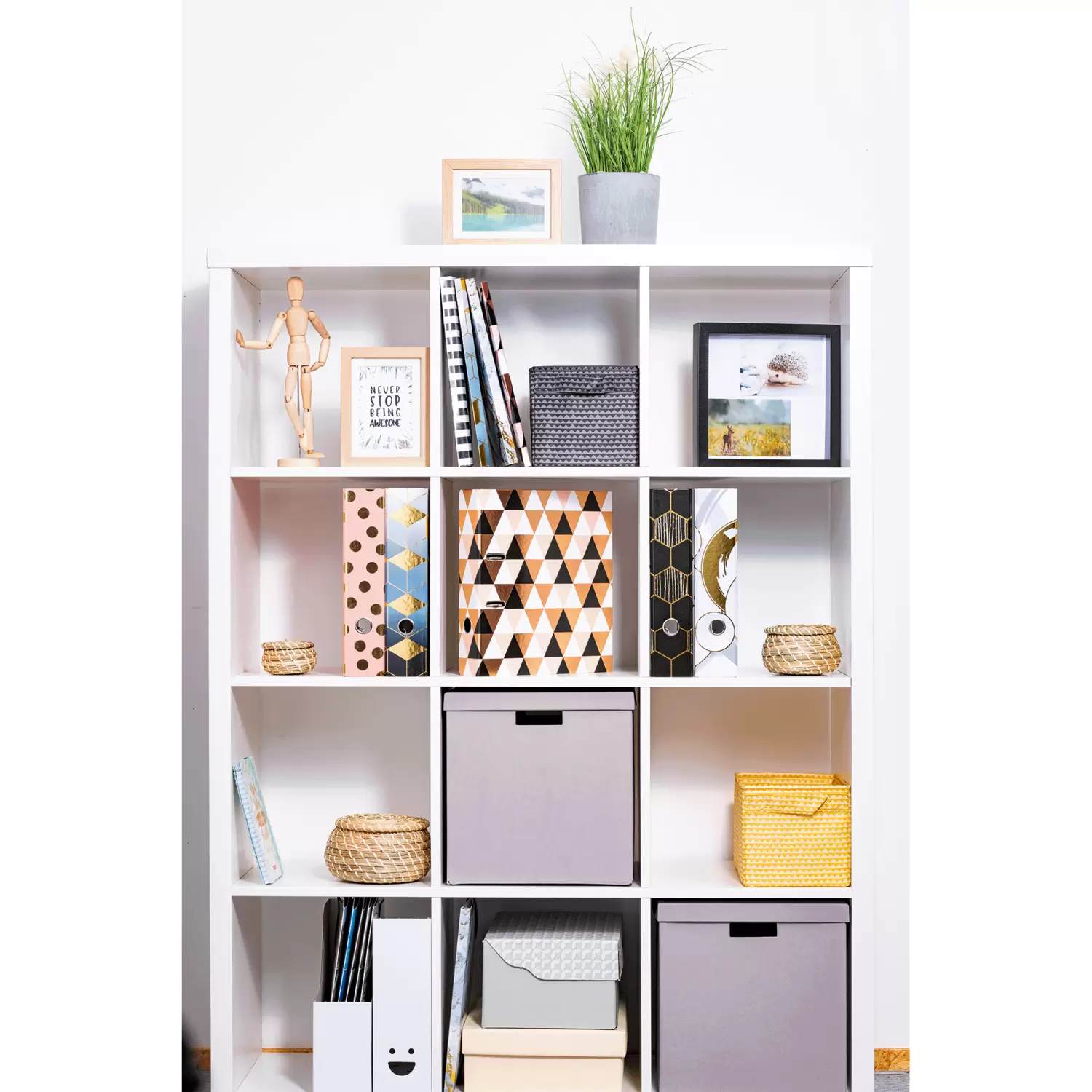 Modernes Design und praktische Funktionalität in Einem: Der neue DIN A4 Motivordner aus der Motivserie Abstract garantiert eine sichere Aufbewahrung von wichtigen Unterlagen und dient gleichzeitig als o ptischer Hingucker. Der neue Ordner von HERMA in modernem Design ist für alle Dokumente in DIN A4 Format geeignet, die in dem schönen Ordner durch den praktischen Niederhalter einfach und zuverlässig beisammen gehalten werden können. Das Griffloch am Rücken des Ordners sorgt dafür, dass sich der Ordner schnell und einfach aus dem Regel ziehen lässt. Durch die stabile Hebelmechanik aus Metall lassen sich die beiden Ringe einfach öffnen und schließen und das Ein- und Aushefte,n sowie Ordnen der Zettel ist ein Kinderspiel. Ob in der Schule, in der Uni, im Büro oder im Alltag zuhause, der dekorative Ordner überzeugt mit seinem bunten Rauten Motiv in den Farben schwarz, weiß und roségold, sowie durch die hochwertige Verarbeitung. Der stabile Karton, aus dem der A4 Ordner angefertigt wurde, ist langlebig und umweltfreundlich. Durch die Rückenbreite von 70 mm hat der bunte Ordner die optimale Breite, um diverse Papiere sicher und sortiert zu verstauen.