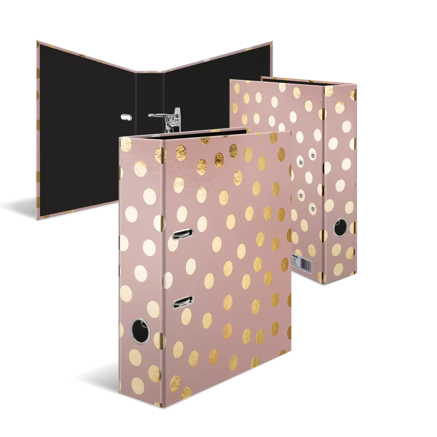 Wenn Ihnen Funktionalität genauso wichtig ist wie originelles Design, ist dieser moderne Motivordner in der Größe DIN A4 mit folienveredelten Punkten in Gold bestens geeignet, um Ordnung und Struktur in Ihren Arbeitsalltag zu bringen. Der Karton, aus dem der Motivordner angefertigt ist, ist umweltfreundlich und schützt den Inhalt optimal vor Außeneinflüssen. Ob in der Schule, Uni oder im Büro, als praktischer Helfer bringt der Ordner Stuktur und eine effiziente Arbeitsweise in den Alltag. Neben den schlichten, aber eleganten Punkten auf einem Hintergrund in wunderschönem Altrosa, kommen die Folienveredelungen noch besser zur Geltung. Der Ordner mit Motiv und Innendruck ist für sämtliche Zettel im DIN A4 Format aus der Schule, Uni oder dem Büro geeignet und kann auch für wichtige Dokumente im Alltag die optimale Lösung sein. Durch die integrierte Hebelmechanik lassen sich die Ringe des stabilen Ordners einfach öffnen bzw. schließen und garantieren ein leichtes Ein- und Ausheften. Papiere einzuordnen oder umzuheften ist dadurch total einfach. Der Niederhalter aus Metall hält das Ganze praktisch und zuverlässig beisammen. Am Rücken des 70 mm breiten Ordners aus Karton befindet sich ein praktisches Griffloch, durch das der Ordner einfach aus dem Regal geholt oder wieder hineingeschoben werden kann. Ergänzend bietet HERMA auch eine Ordnungsmappe an, die im gleichen Design gestaltet ist. Bereiten Sie Ihrem Papier-Chaos ein Ende, mit diesem modernen Ordner von HERMA.