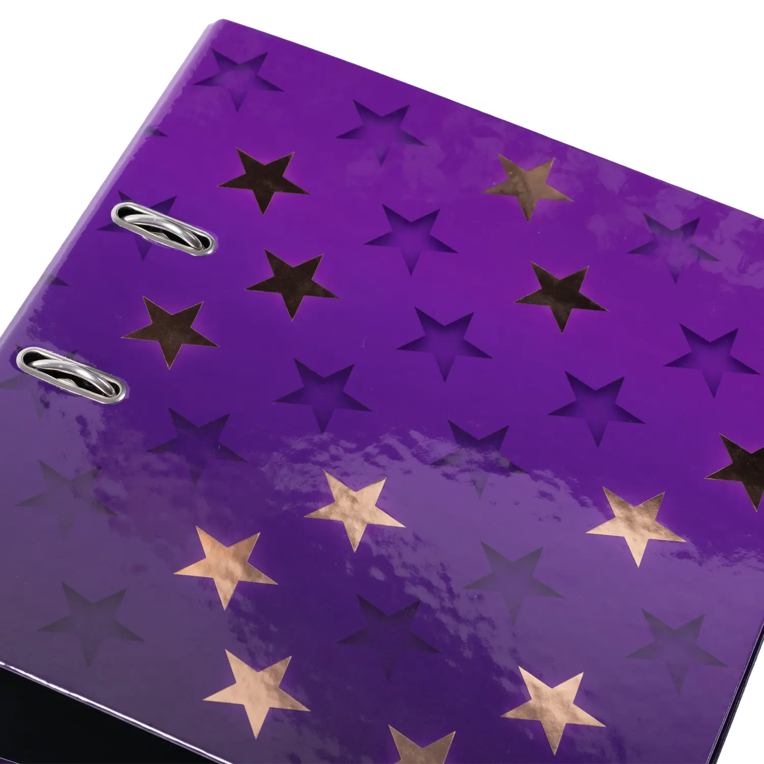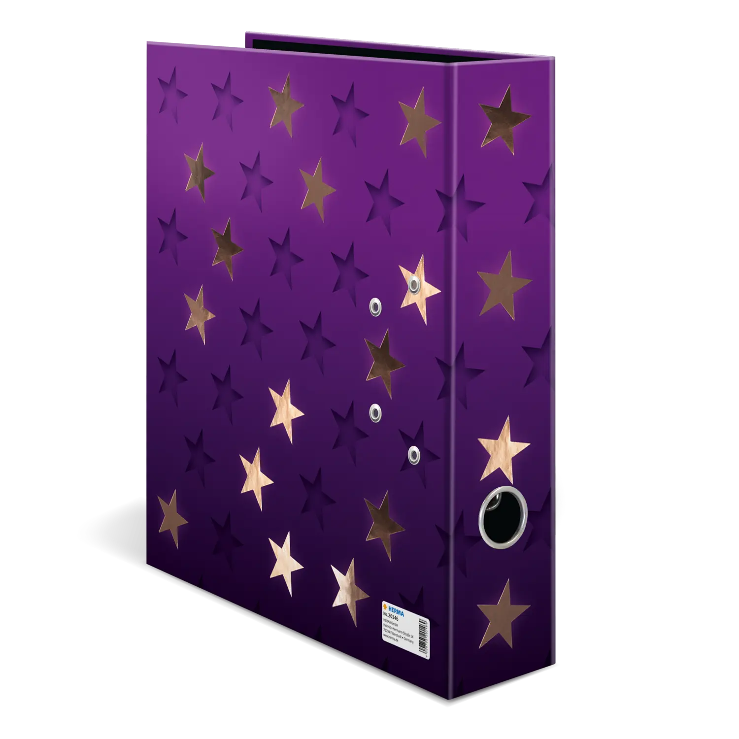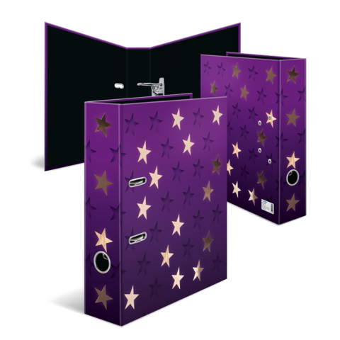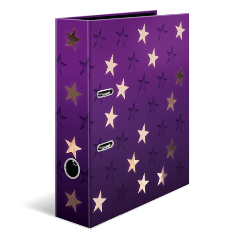 Der Motiv Ordner Stars ist etwas ganz Besonderes, denn er vereint Design und Funktonalität auf höchstem Niveau. Das tief dunkelviolette Design bringt in Kombination mit der glänzend schimmernden Roségold Foli enveredelungen die Sterne des Motivs wie am Nachthimmel zum Strahlen. Der stylische Tiefeneffekt versetzt dem Ordner außerdem einen zusätzlichen Hingucker und sorgt dafür, dass die Sterne beinahe wie gestanzt aussehen. Ein Highlight und Hingucker! Der Ordner ist aus hochwertigem Karton hergestellt, mit Roségoldfolie veredelt und durch das praktische Griffloch ganz einfach hervorzuholen und wieder zurückzustellen. Die spezielle Hebelmechanik mit Niederhalter aus Metall sorgt dafür, den Ordnerinhalt ordentlich und stabil beisammen zu halten. Der breite Rücken garantiert Stabilität im Regal und ausreichend Platz für viele Unterlagen im Format bis DIN A4.