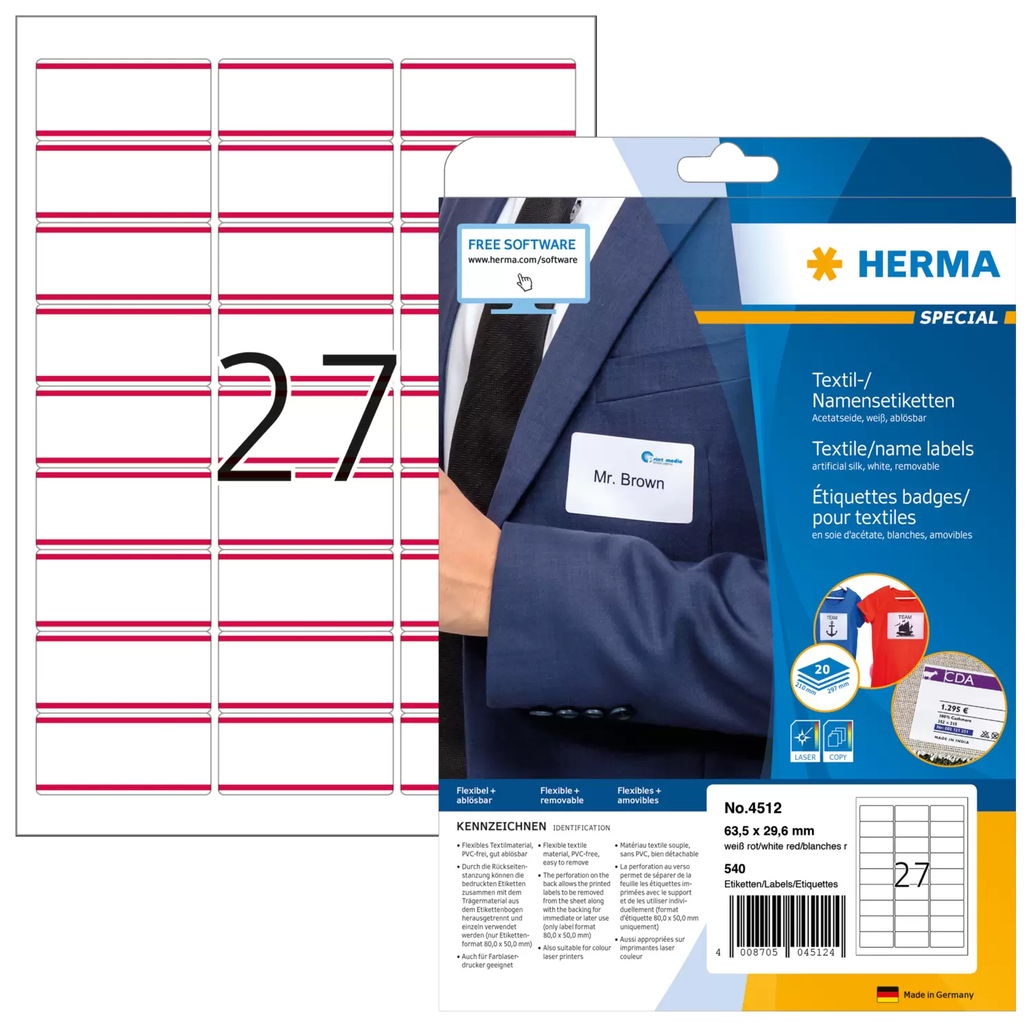 Namensetiketten, ablösbar, A4, 63,5 x 29,6 mm, weiß rote Streifen, aus Acetatseide, bedruckbar