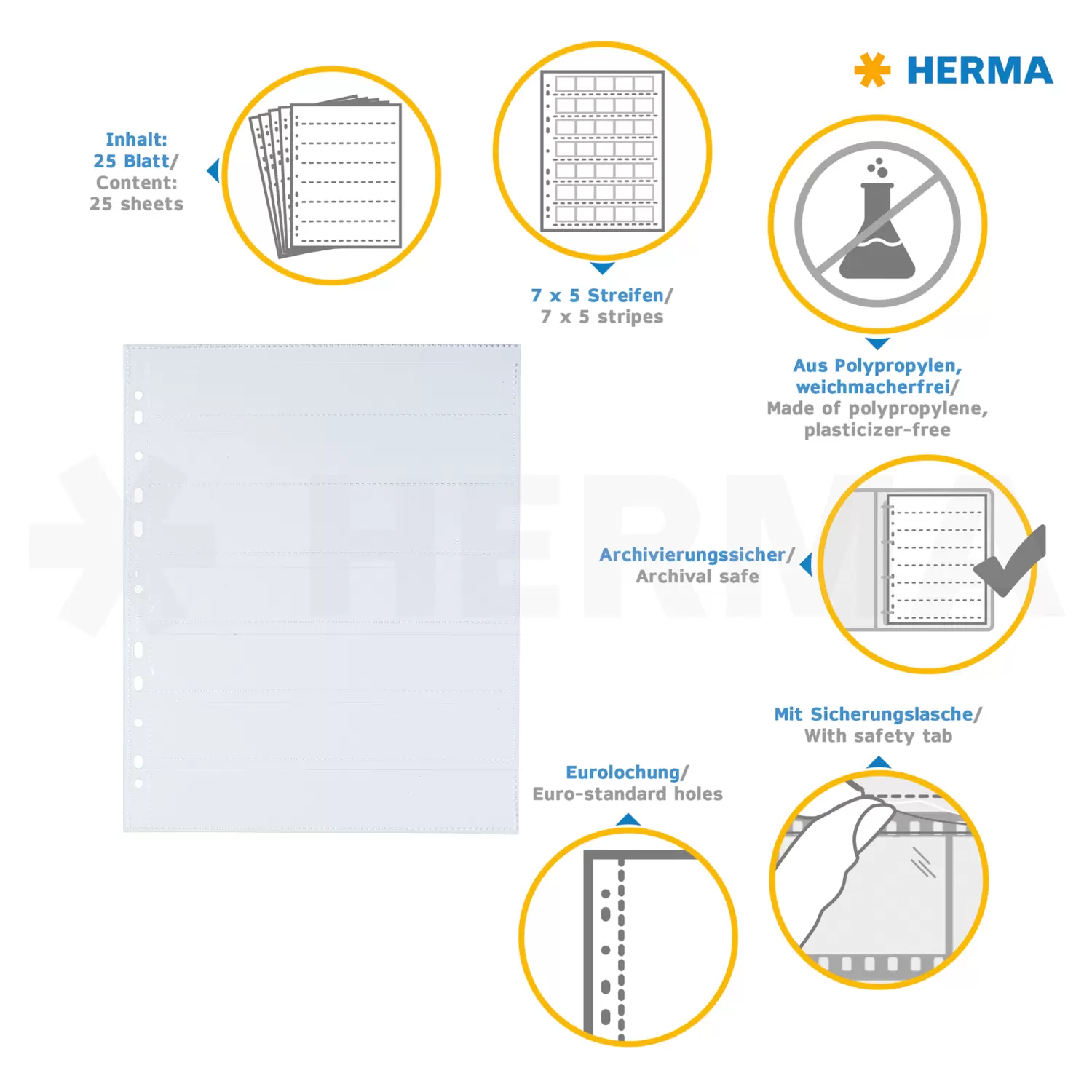 Die Herma Negativhüllen für Kleinbildnegative sind ideal zum sauberen und übersichtlichen Aufbewahren und Archivieren von Negativstreifen. Sie bestehen aus transparentem, robustem und weichmacherfreiem Polypropylen und bieten pro Hülle Platz für 7 Streifen à 5 Bilder im Format 35 mm. Das Besondere sind die speziellen Sicherungslaschen, die das Herausfallen der Negative aus den Hüllen verhindern. So lassen sich die Negative komfortabel einstecken und entnehmen und sind dennoch optimal geschützt. Eine Hülle ist ca. 24,3 x 29,7 cm groß und lässt sich durch die Eurolochung ganz einfach in Ordner, Ringbücher oder Fotobooks einheften. Für optimalem Halt werden Varianten mit 4 Ring-System empfohlen. In einer Packung sind 25 Hüllen enthalten und somit genügend Platz für bis zu 175 Streifen und 875 Negative.