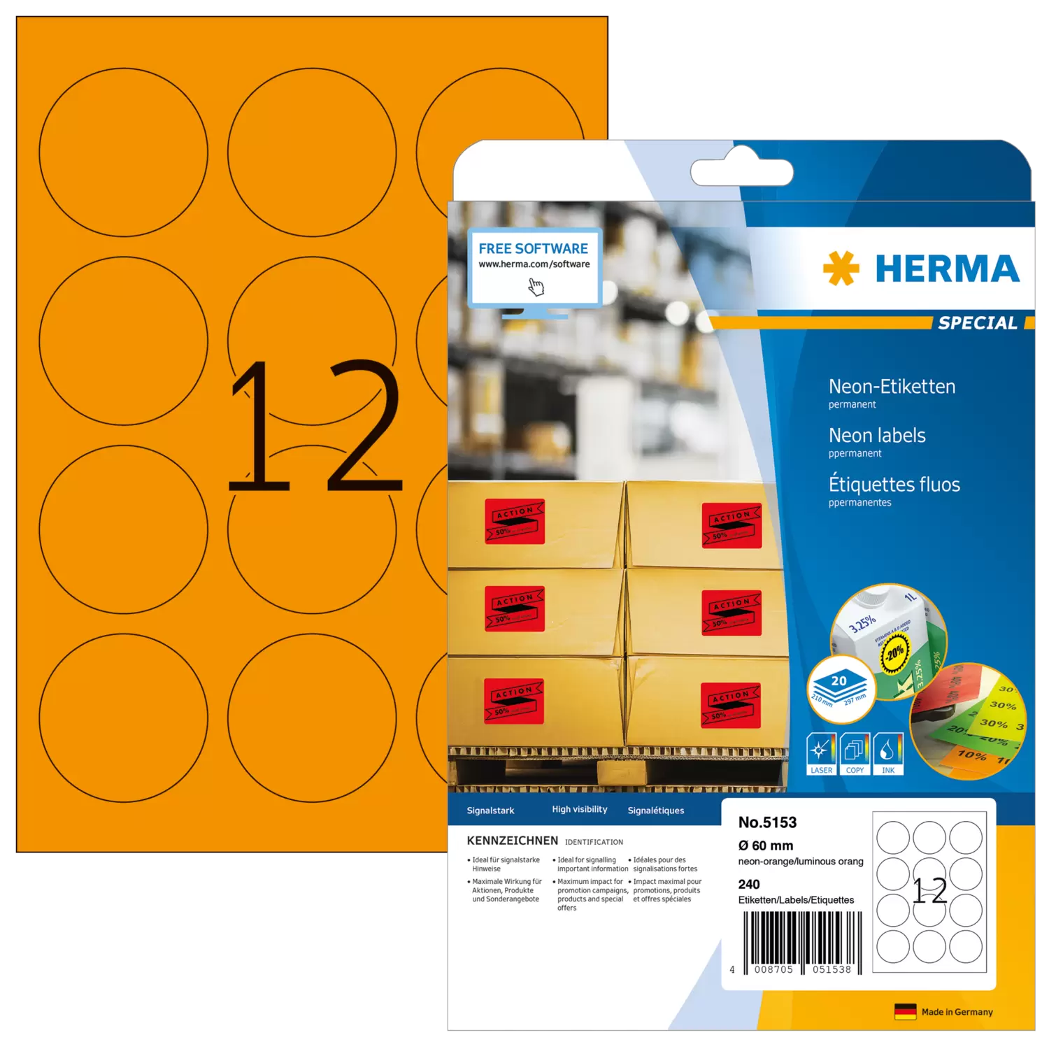 Neonetiketten A4, Ø 60 mm, rund, leuchtorange, permanent haftend