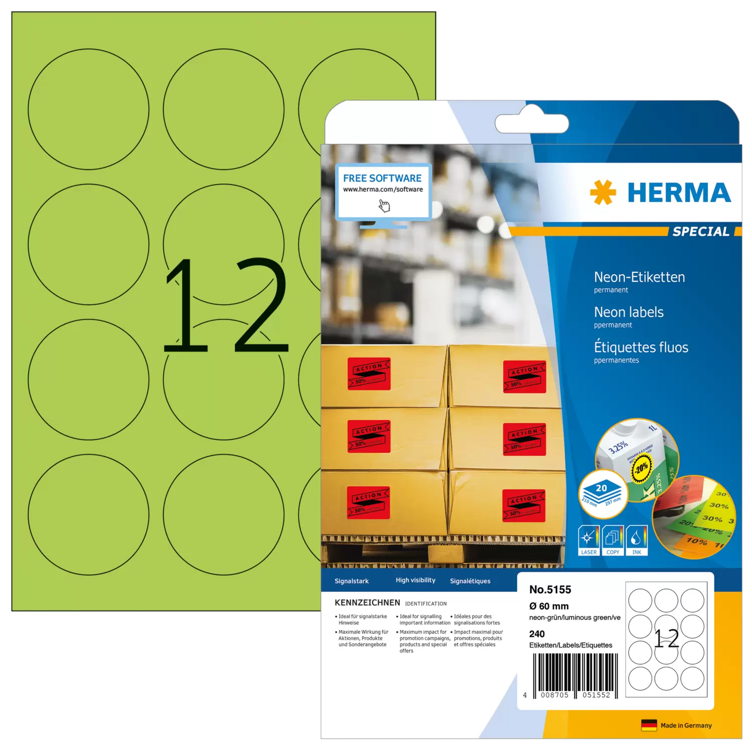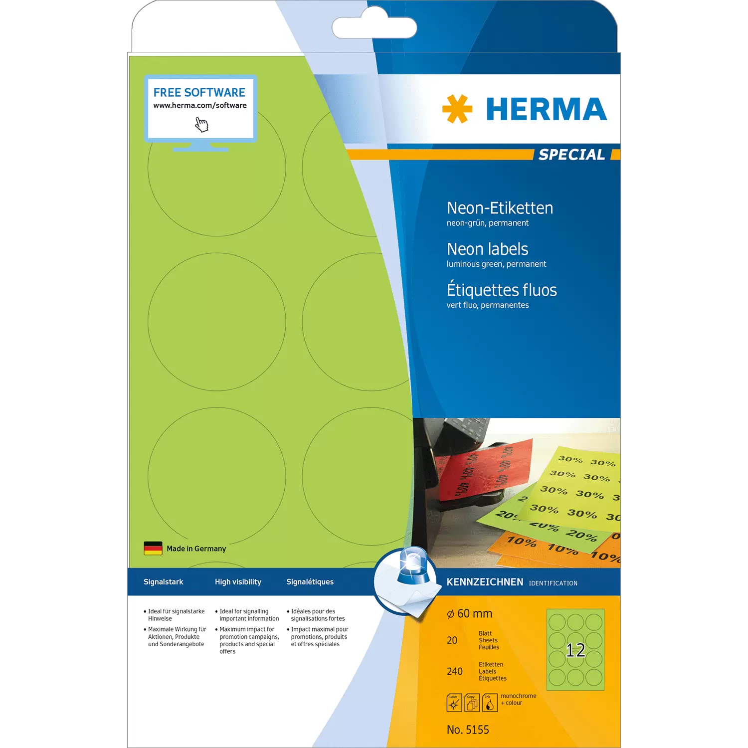 Etiketten in Neonfarben für Informationen mit Signalwirkung, auf A4-Blättern, selbstklebend. Auffallend und informativ: ideal für Kennzeichnungen mit Signalcharakter, z. B. Warnhinweise, Eilvermerke, Aktionen, Farbcodierungen,... In 4 signalstarken Neonfarben, FSC® Mix Credit-zertifiziert. Für Laser- und Inkjetdrucker, Kopierer, Farblaserdrucker und Farbkopierer geeignet. Störungsfreie Verarbeitung durch Rundum-Sicherheitskante und optimale Planlage. Kostenlose Softwarelösungen: www.herma.de/software.