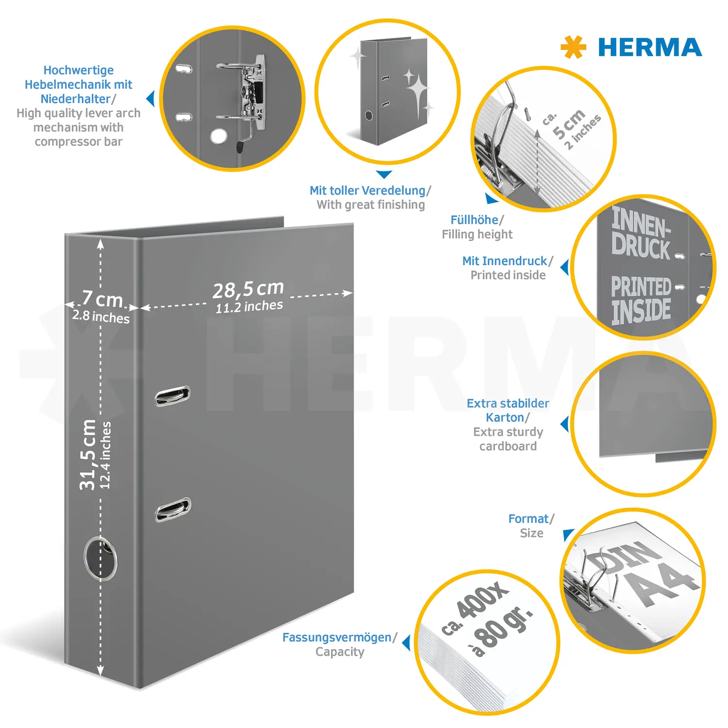 - Rückenbreite 70 mm, geeignet für A4, mit Griffloch, hochwertiger Hebelmechanik und Niederhalter