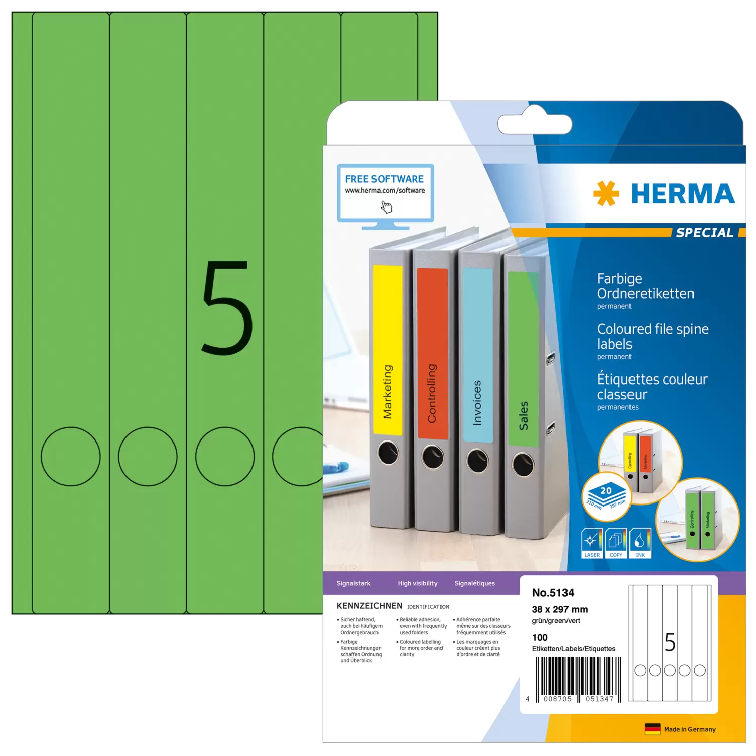 Ordneretiketten auf A4-Blättern, selbstklebend. Für ein einheitliches Erscheinungsbild im Büro und Zuhause. Für alle gängigen Ordner geeignet. Blanko: Ideal für Firmenlogo, Beschriftungen und Ordnungsvermerke. Sicher haftend, auch bei häufigem Ordnergebrauch. Umweltfreundlich: hochwertiges, chlorfrei gebleichtes Spezialpapier, lösemittelfreier Haftkleber. Etiketten sind 100 % recyclingfähig mit dem Altpapier, Verpackung aus Recyclingkarton. Sehr gute Druckergebnisse auf allen Laser- und Inkjetdruckern, Kopierern, Farblaserdruckern und Farbkopierern. Störungsfreie Verarbeitung durch Rundum-Sicherheitskante und optimale Planlage. Kostenlose Softwarelösungen: www.herma.de/software.