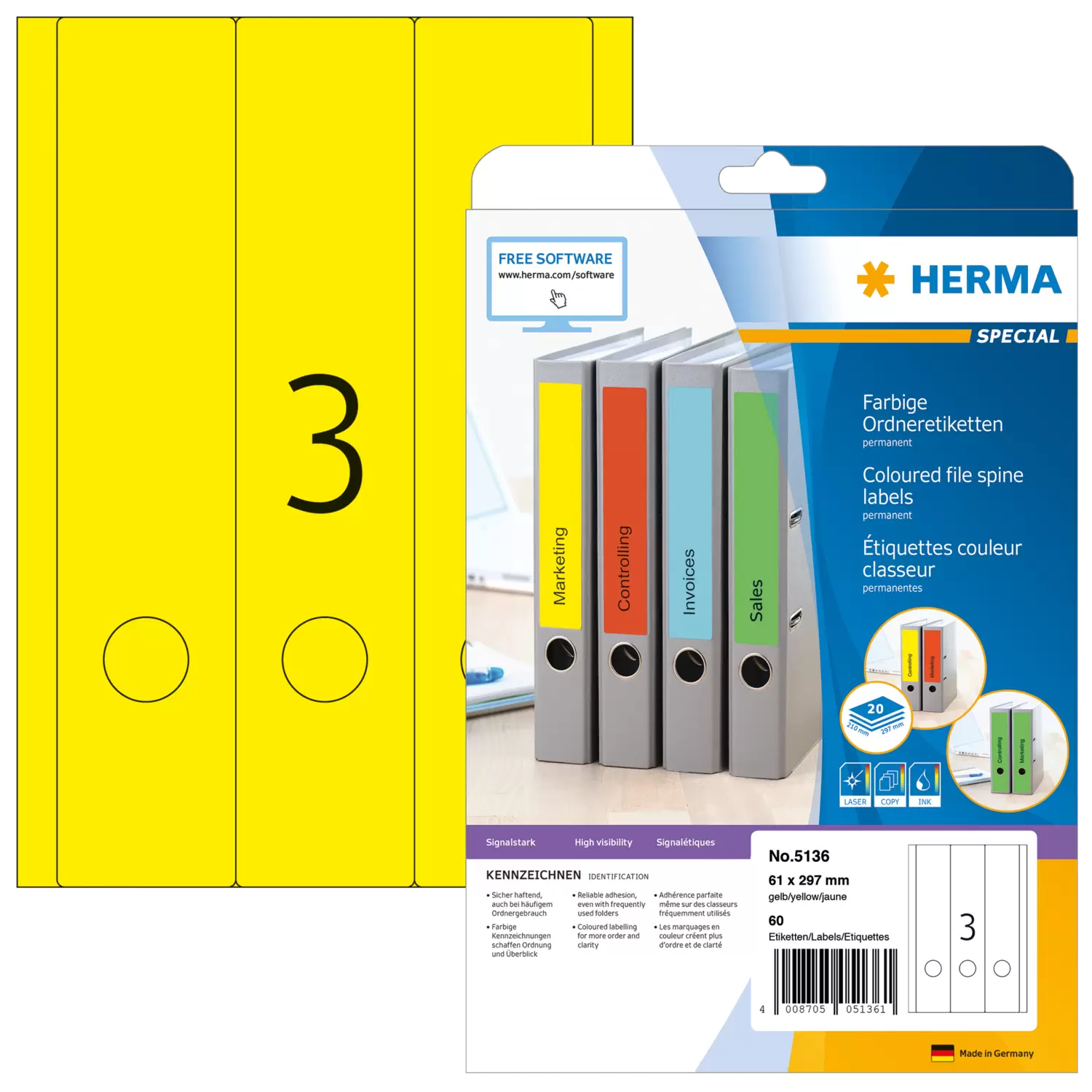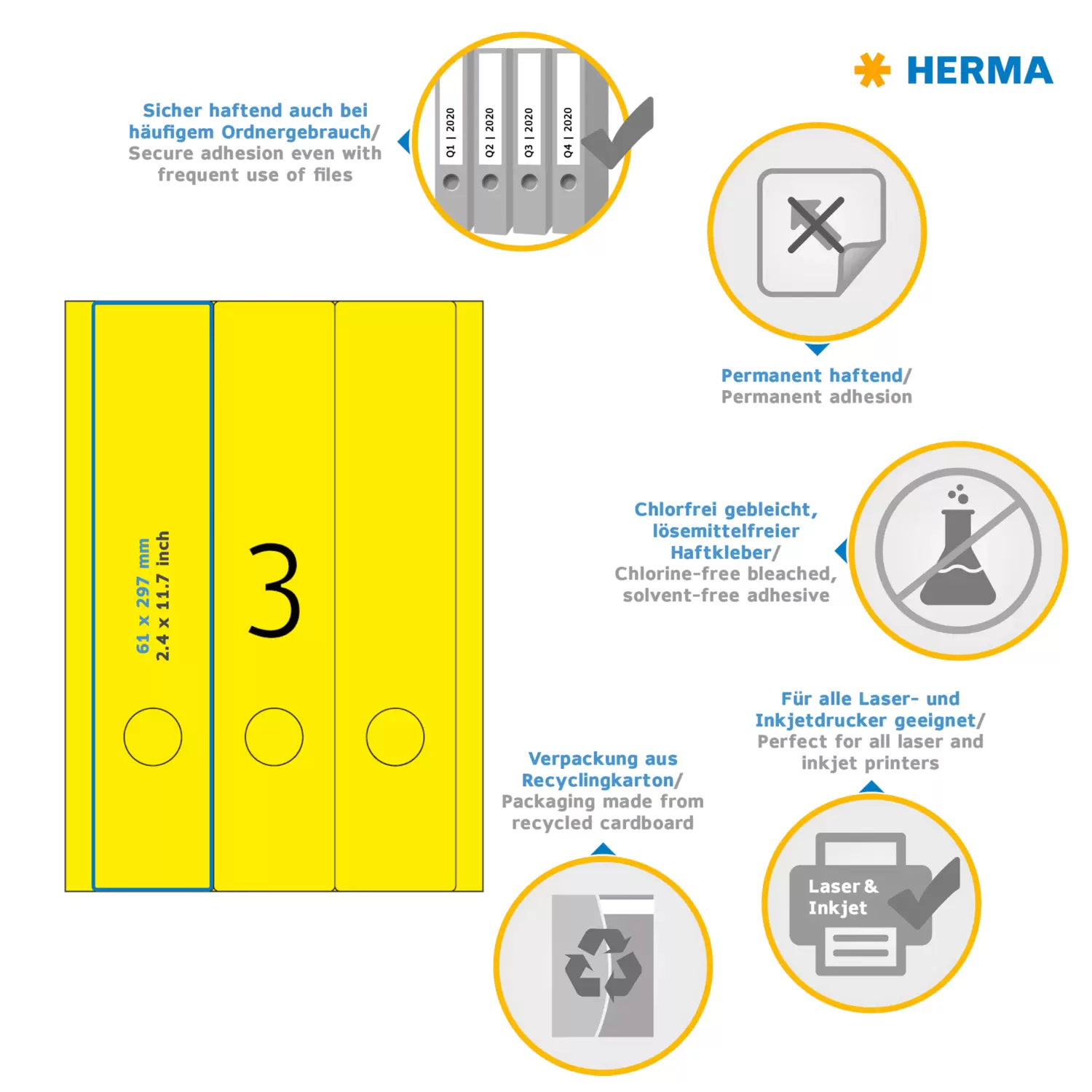Ordneretiketten auf A4-Blättern, selbstklebend. Für ein einheitliches Erscheinungsbild im Büro und Zuhause. Für alle gängigen Ordner geeignet. Blanko: Ideal für Firmenlogo, Beschriftungen und Ordnungsvermerke. Sicher haftend, auch bei häufigem Ordnergebrauch. Umweltfreundlich: hochwertiges, chlorfrei gebleichtes Spezialpapier, lösemittelfreier Haftkleber. Etiketten sind 100 % recyclingfähig mit dem Altpapier, Verpackung aus Recyclingkarton. Sehr gute Druckergebnisse auf allen Laser- und Inkjetdruckern, Kopierern, Farblaserdruckern und Farbkopierern. Störungsfreie Verarbeitung durch Rundum-Sicherheitskante und optimale Planlage. Kostenlose Softwarelösungen: www.herma.de/software.