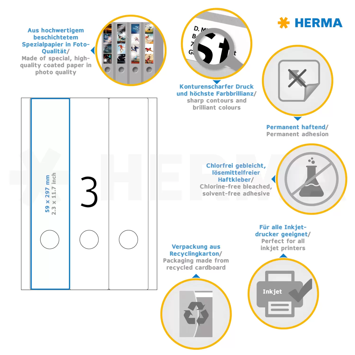 Ordneretiketten auf A4-Blättern, selbstklebend. Hervorragende Inkjetdrucke in Schwarz und Farbe. Aus hochwertigem, gestrichenem Spezialpapier, 90 g/m² für konturenscharfe und farbbrillante Drucke in Foto-Qualität. Blanko: Ideal für Firmenlogo, Beschriftungen und Ordnungsvermerke. Sicher haftend, auch bei häufiger Verwendung des Ordners. Mit umlaufendem Rand: vollflächig bedruckbar und ideal auch für Inkjetdrucker mit kritischen Papierführungen. Kostenlose Softwarelösungen: www.herma.de/software.