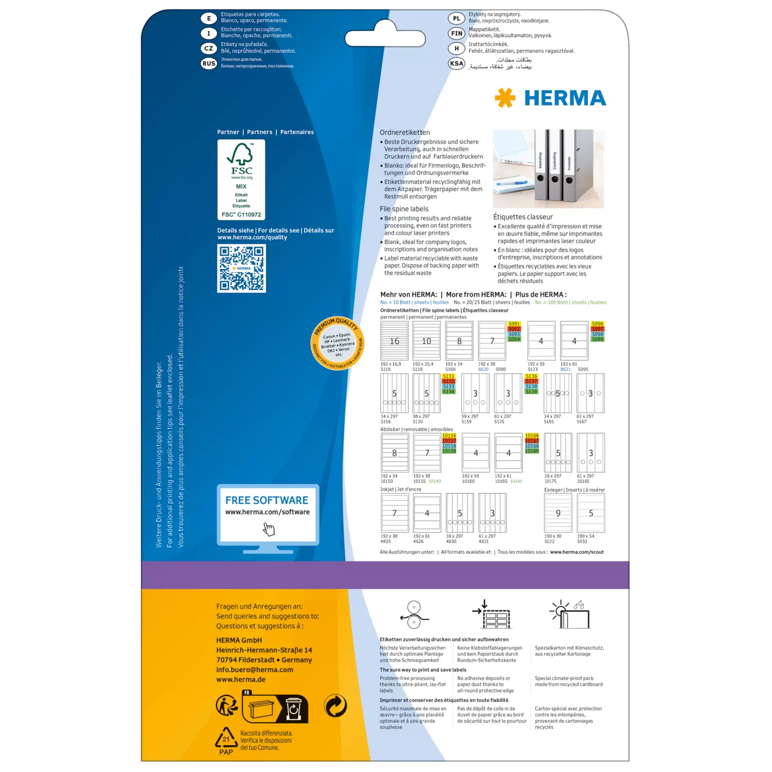 Ablösbare Ordneretiketten auf A4-Blättern. Sicher haftend, auch bei häufigem Ordnergebrauch, rückstandsfrei wieder abziehbar ohne den Ordner zu beschädigen. Absolut blickdichtes Material mit hohem Weißgrad, alte Ordnerbeschriftungen scheinen nicht durch. Blanko: Ideal für Firmenlogo, Beschriftungen und Ordnungsvermerke. Umweltfreundlich: FSC® Mix Credit-zertifiziert, chlorfrei gebleicht, lösemittelfreier Haftkleber. Etiketten sind 100 % recyclingfähig mit dem Altpapier, Verpackung aus Recyclingkarton. Sehr gute Druckergebnisse auf allen Laser- und Inkjetdruckern, Kopierern, Farblaserdruckern und Farbkopierern. Störungsfreie Verarbeitung durch Rundum-Sicherheitskante und optimale Planlage. Kostenlose Softwarelösungen: www.herma.de/software.