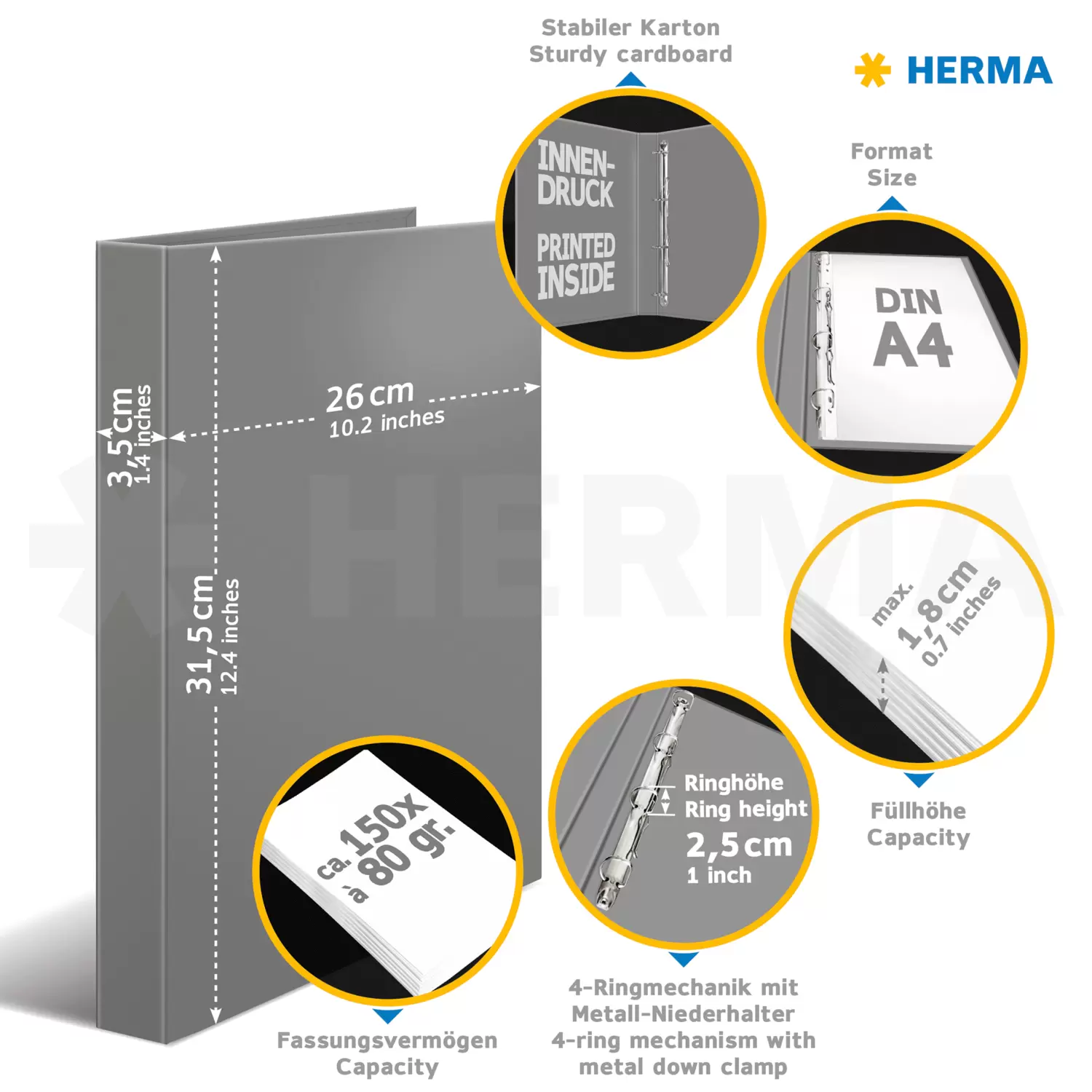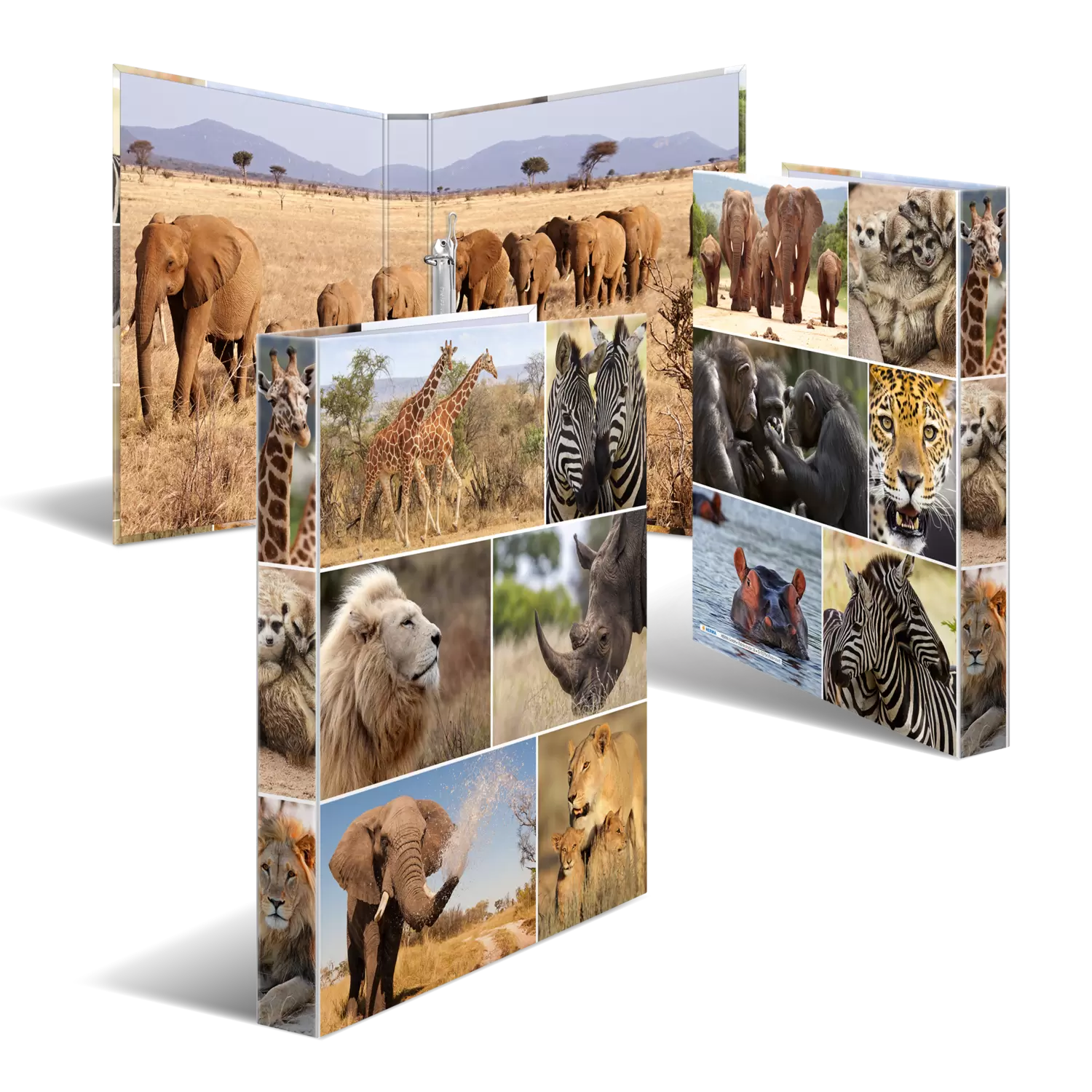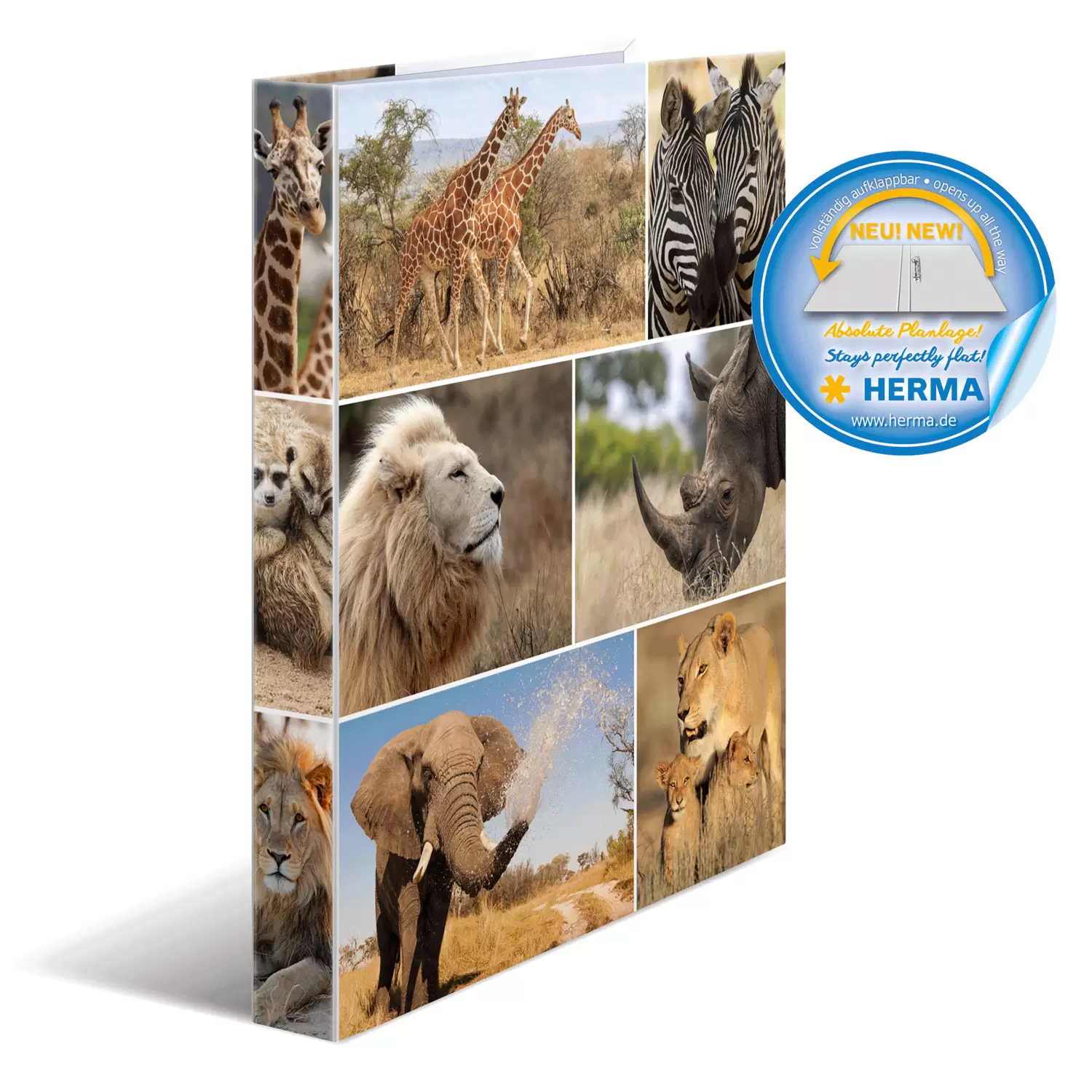 Ordnung muss sein – Spaß aber auch! Wer beschäftigt sich wirklich gerne mit Papierkram? Genau, Niemand. Aber irgendwann müssen Dokumente, Briefe, Abrechnungen und Bescheide nun mal sortiert und abgeheftet werden. Mit den HERMA Ringbüchern im praktischen Format für alle Papiere bis zur Größe Din A4 lassen sich alle Unterlagen ordentlich und übersichtlich aufbewahren. Wird ein Schriftstück für ein Amt, eine Behörde oder die Versicherung benötigt ist alles schnell zur Hand. Und auch für das private Vergnügen sind die Ordner bestens geeignet: zum Sammeln von Rezepten, zur Urlaubsplanung oder als Familienplaner – hier findet alles seinen Platz. Und das beste: mit den tollen Animal-Designs ist die Ordnerserie im Regal ein echter Hingucker. Denn das Auge ordnet ja schließlich mit. Mit dem brandneuen Design Afrika Tiere wird's wild! Das Ringbuch ist mit 16 tollen Tierfotografien gestaltet, mit dabei sind unter anderem Giraffen, Elefanten, Löwen und Erdmännchen. Die praktische 2-Ring-Mechanik und der Niederhalter sorgen für optimalen Halt.