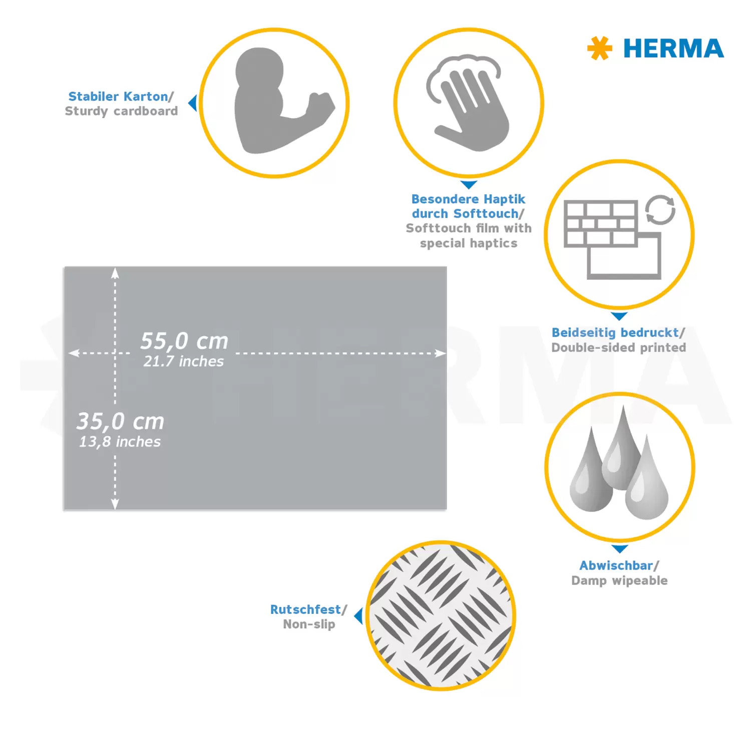 Diese tierische und reflexionsfreie Schreibtischauflage von HERMA trägt in erheblichem Maße zur Schonung des Schreibtisches Ihrer Kleinen bei und bewahrt diesen vor Kratzern und anderen Beschädigungen. He rumgeschobene Tastaturen, fallengelassene Gegenstände oder unsanft abgestellte Tassen können ohne eine Schreibtischunterlage im Laufe der Zeit unschöne Spuren auf der Oberfläche hinterlassen. Vor allem macht die Schreibtischauflage jedoch das Arbeiten erheblich komfortabler. Aufgrund der Softtouch-Oberfläche ist es ein Leichtes für Ihr Kind, auf der Unterlage Hausaufgaben zu erledigen. Das Schreiben, Malen, Basteln und Zeichnen fällt somit sehr viel leichter, als auf einer harten Oberfläche. Die Hände ruhen auf einem angenehm weichen Untergrund und die schreibelastische Oberfläche stellt sicher, dass Schreibgeräte wie Stifte oder Füller beim Schreiben ein perfektes Maß an Widerstand er halten. Das wirkt sich nicht nur äußerst positiv auf die Schrift Ihres Kindes aus, sondern vermeidet auch, dass beispielsweise Kugelschreiber aufgrund eines zu harten Untergrunds ihren Dienst verweigern. Die Unterlage hat mit 550 x 350 mm ein optimales Format und ist aufgrund der wilden Tiermotive ein echter Hingucker auf dem Schreibtisch. Das Material besteht aus hochwertigem und beschichtetem Karton, ist rutschfest und dementsprechend ideal zum Bearbeiten von Schulaufgaben.