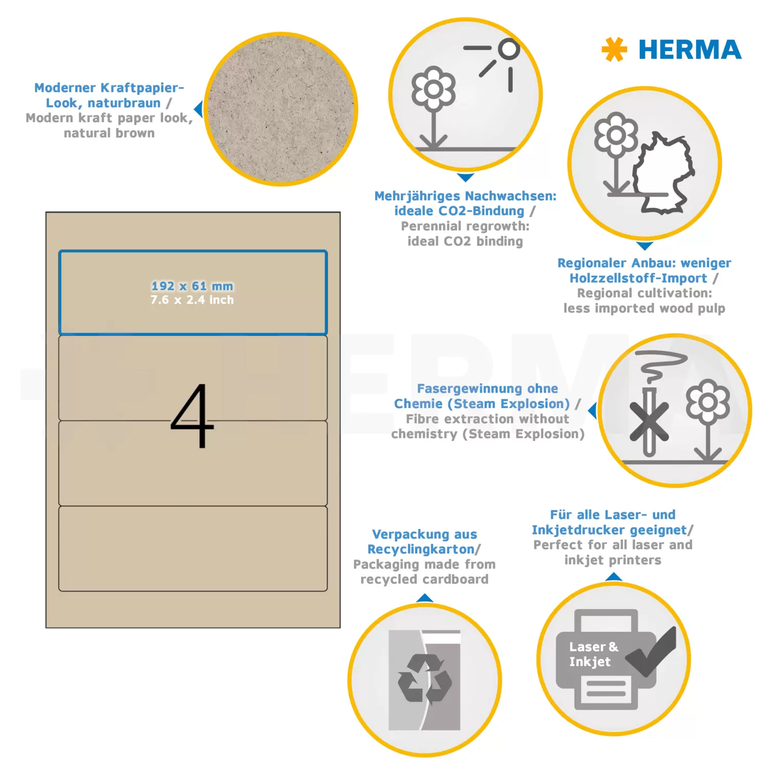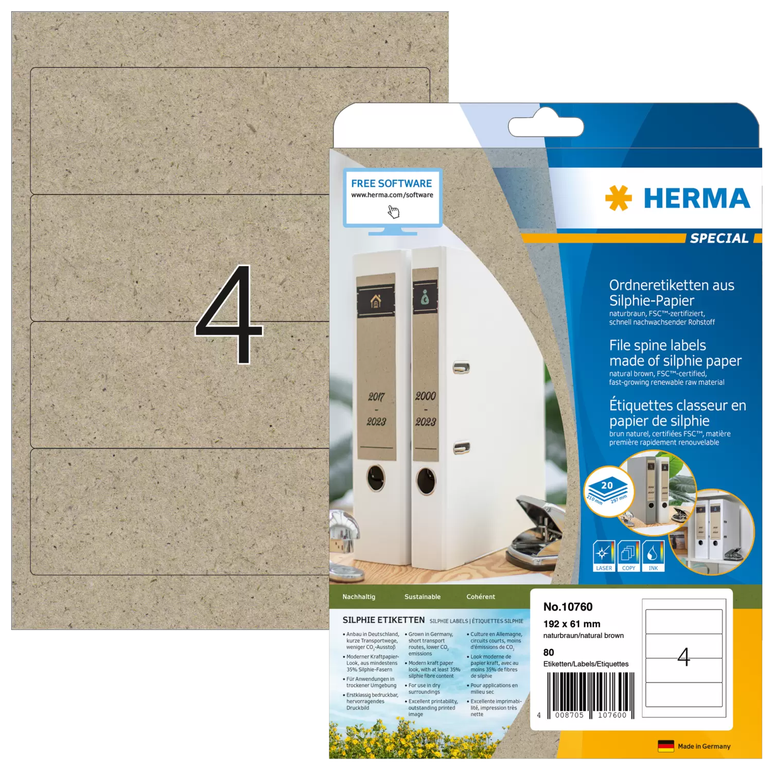 Das besondere Papier aus der Königin der ökologischen Nutzpflanzen - der Donau Silphie. Lebensraum für Bienen, zur Energiegewinnung, ideale CO2 Bindung und ein Mehrwert für das Ökosystem. Ein Beitrag zur Nachhaltigkeit. FSC® Mix Credit-zertifiziert. Anbau in Deutschland, kurze Transportwege, weniger CO2-Ausstoß. Moderner Kraftpapier-Look, aus mindestens 35% Silphie-Fasern. Für direkten Lebensmittelkontakt geeignet. Etikettenpapier recyclebar mit dem Altpapier. Vom Etikett bis zur Verkaufsverpackung: rundum nachhaltig. Sehr gute Druckergebnisse auf allen Laser- und Inkjetdruckern, Kopierern, Farblaserdruckern und Farbkopierern. Kostenlose Softwarelösungen: www.herma.de/buero-zuhause/vorlagen-software.