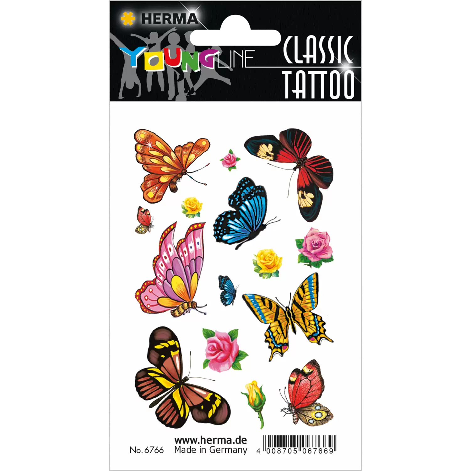 Schmetterlinge gehören zu den beliebtesten Tätowierungen, die es gibt und kommen sowohl bei Kindern, als auch Erwachsenen gut an. Das kann an der Vielfalt liegen, die diese schönen Geschöpfe der Natur liefern und an den hübschen, diversen Farben. Zwischen den vielen verschiedenen Schmetterlingsarten, die es auf der Welt gibt, sind in dieser Verpackung sieben unterschiedliche Arten enthalten. Zusätzlich zu den zauberhaften Schmetterlingen, gehören anmutige Rosen in gelb und rosa zum Inhalt. Je nach Geschmack kann entschieden werden, wieviele der enthaltenden Motive und auf welchen Körperstellen die Tattoos auf der Haut aufgetragen werden sollen. Sowohl im Sommer als auch im Winter sowie für verschiedene Anlässe sind die farbigen Schmetterlinge ein hübscher Hingucker und immer eine gern genommene Motivauswahl. Durch die hochwertige Transferfolie, aus der die Schmetterlinge angefertigt sind, lassen sich die Tattoos kinderleicht auf der Haut auftragen und mit Hilfe von Babyöl und einem Schwamm genauso einfach wieder entfernen. In einer Verpackung sind 15 Tattoos enthalten.