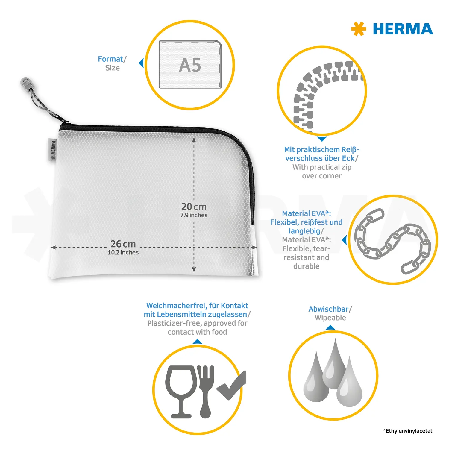 - HERMA Universaltasche A5, mit praktischem Reißverschluss, gelb eingefassten Nähten, 26 x 20 cm