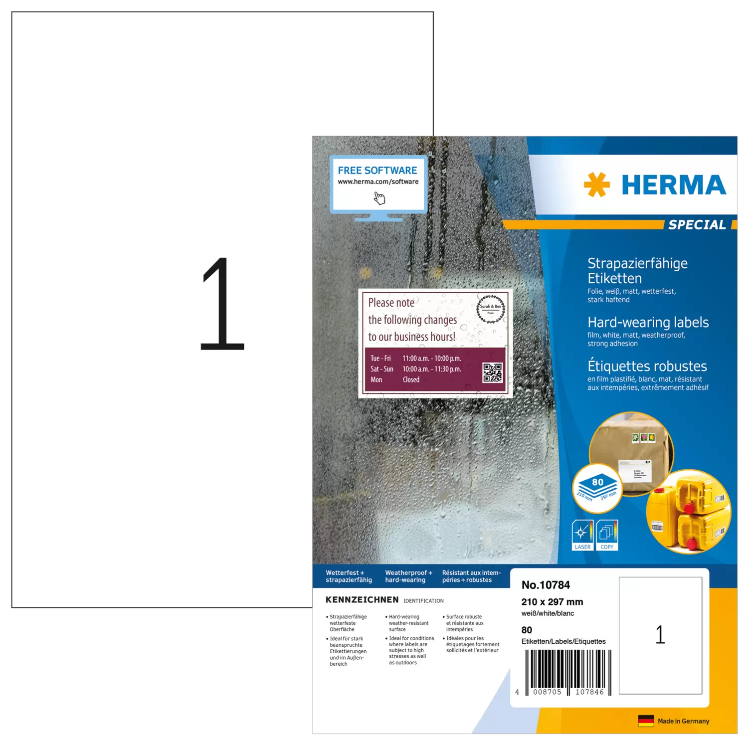 Weiße matte Folien-Etiketten auf A4-Blättern, selbstklebend. Ideal für stark beanspruchte Etikettierungen und im Außenbereich: Eigentumsetiketten, Schaufensteraufkleber, Hinweis- und Warnschilder, Kennzeichnungen in Lager und Produktion. Strapazierfähige wetterfeste Oberfläche, besonders stark haftend, alterungsbeständig, Öl und Schmutz abweisend, abwaschbar, temperaturbeständig von -30 bis +80 °C. Störungsfreie Verarbeitung durch Rundum-Sicherheitskante und optimale Planlage. Für Laserdrucker und Kopierer, Farblaserdrucker und Farbkopierer. Nicht für Inkjetdrucker geeignet. Kostenlose Softwarelösungen: www.herma.de/software.