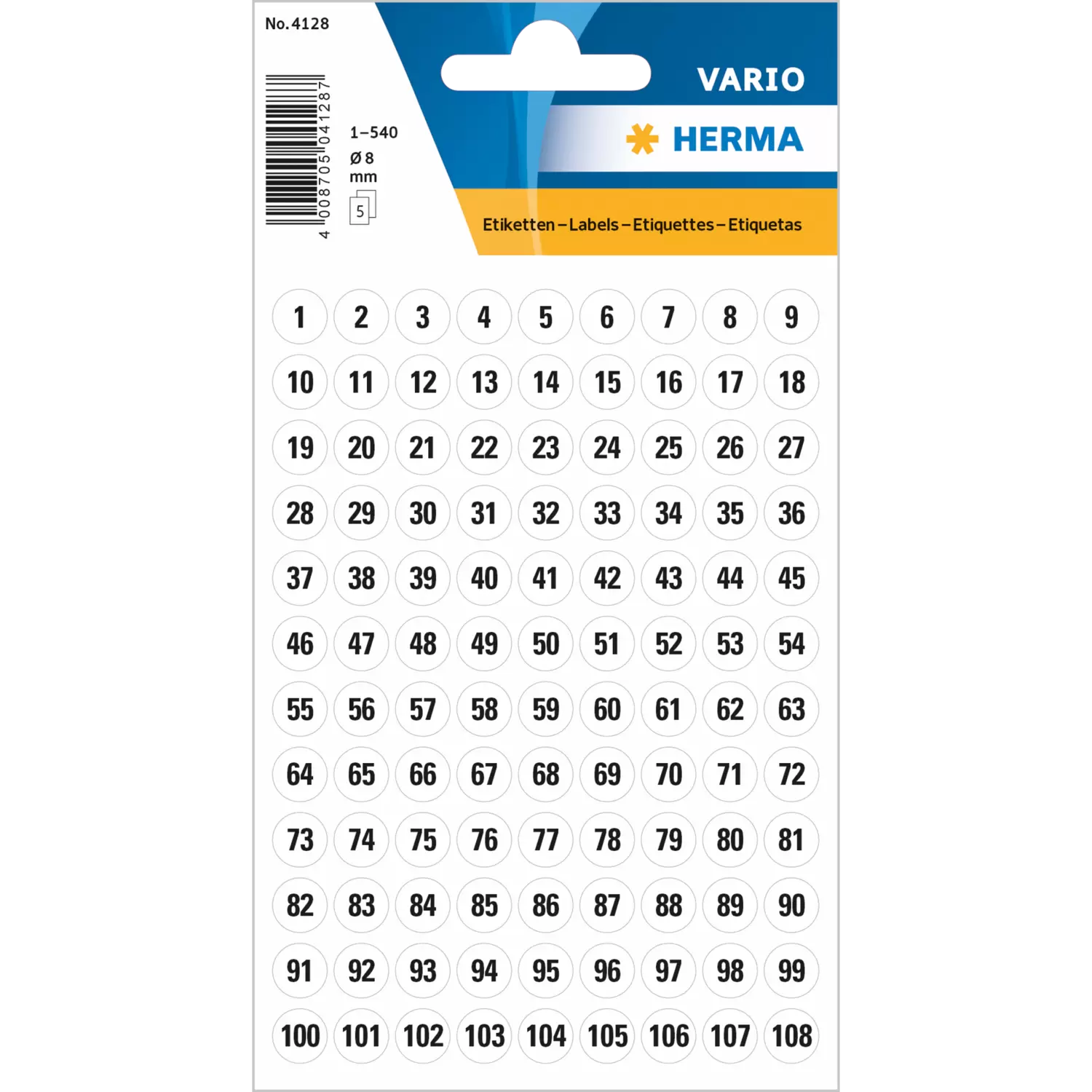 Zahlen Ø 8 mm 1-540 Papier weiß schwarz 5 Bl.
